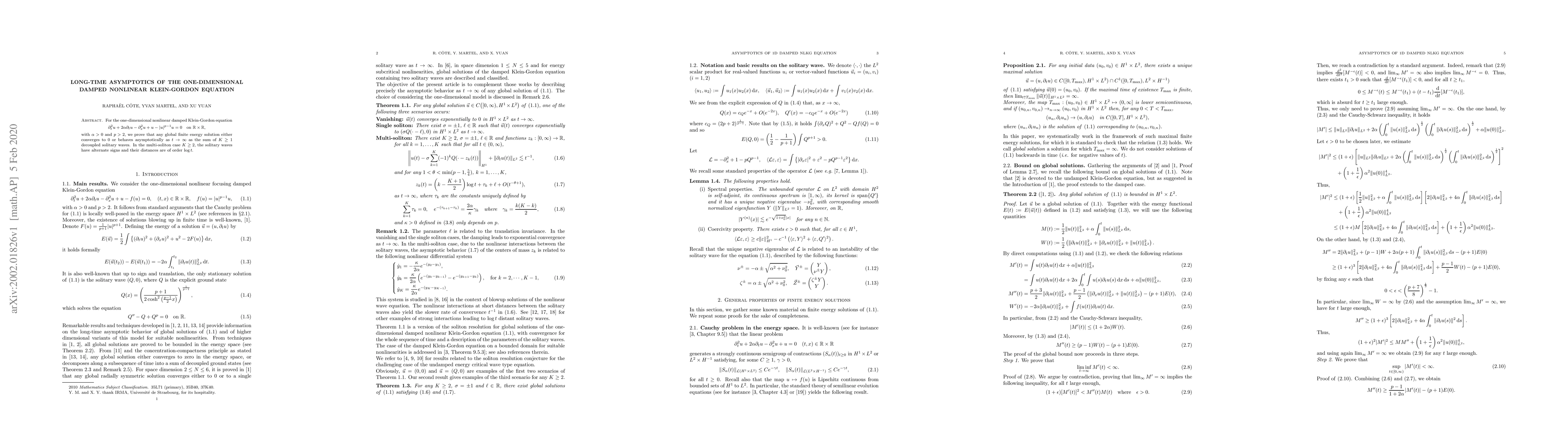 This paper investigates the long-term behavior of solutions to the one-dimensional damped nonlinear Klein-Gordon equation, proving that global finite energy solutions either decay to zero or asymptotically resemble a sum of decoupled solitary waves as time approaches infinity, with multi-soliton cases exhibiting alternating signs and logarithmically spaced distances.