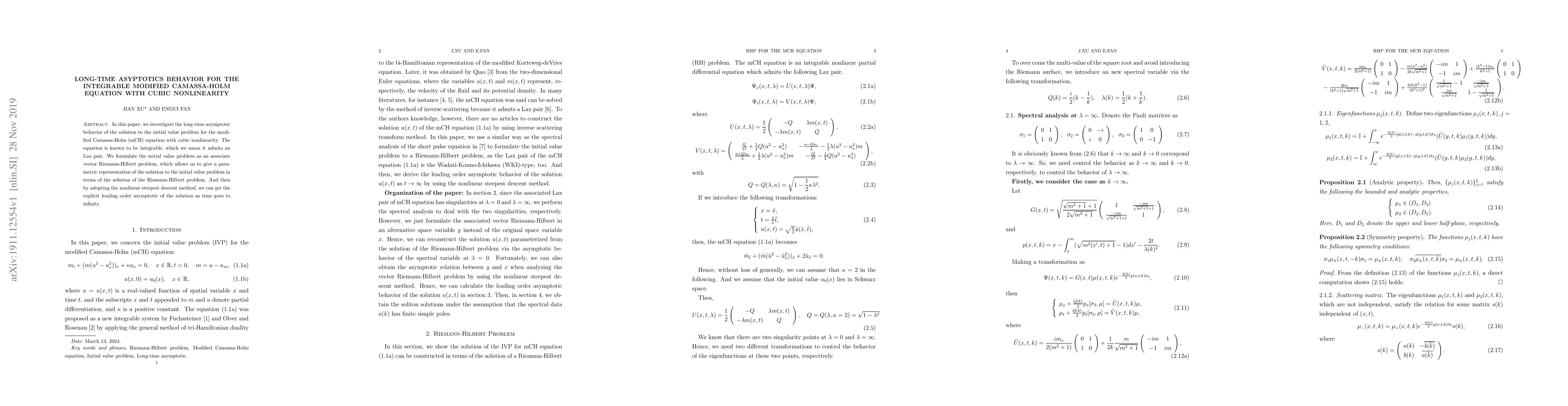 The research employs the nonlinear steepest descent method to derive the asymptotic behavior of the solution \(u(x,t)\) of the modified Camassa-Holm (mCH) equation with cubic nonlinearity as time goes to positive infinity.