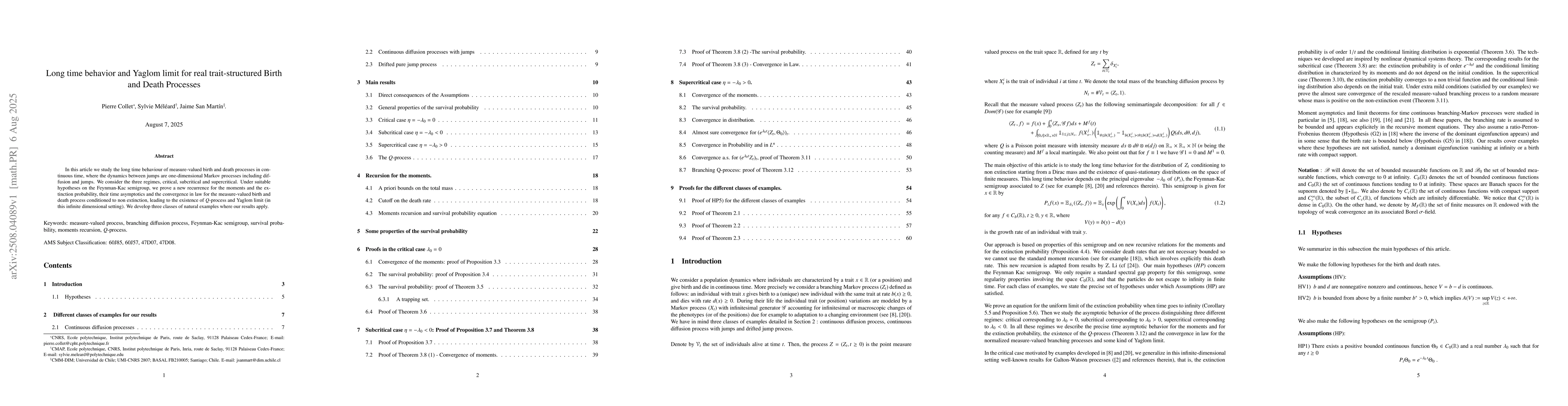 In this article we study the long time behaviour of measure-valued birth and death processes in continuous time, where the dynamics between jumps are one-dimensional Markov processes including diffusion and jumps. We consider the three regimes, critical, subcritical and supercritical. Under suitable hypotheses on the Feynman-Kac semigroup, we prove a new recurrence for the moments and the extinction probability, their time asymptotics and the convergence in law for the measure-valued birth and death process conditioned to non extinction, leading to the existence of Q-process and Yaglom limit (in this infinite dimensional setting). We develop three classes of natural examples where our results apply.