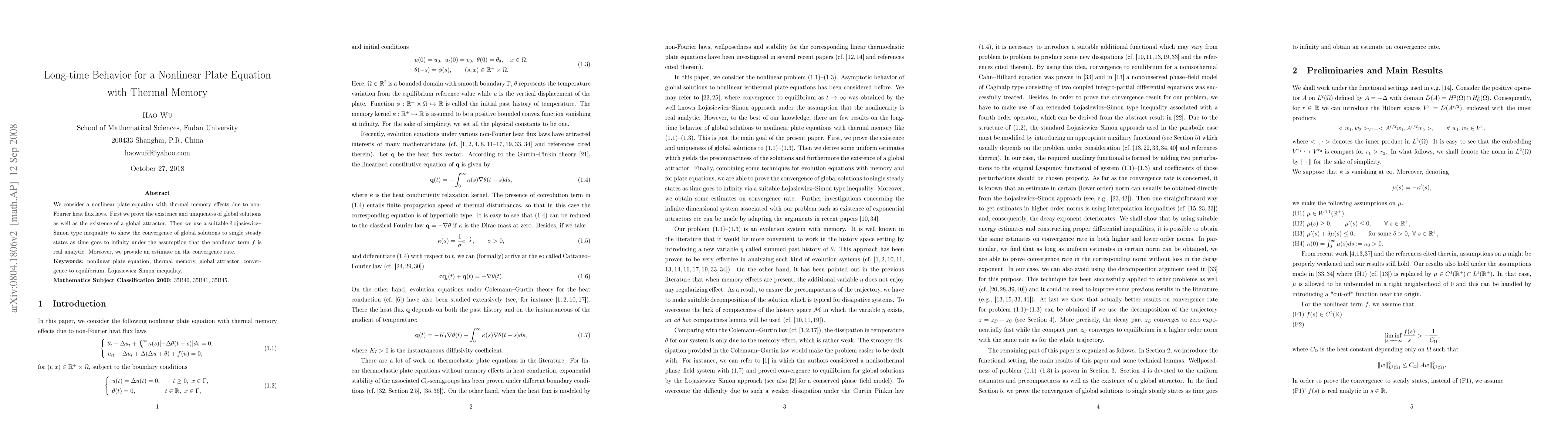 Research shows that solutions to a nonlinear plate equation with thermal memory effects converge to steady states over time, with faster convergence rates for real-analytic non-linear terms.