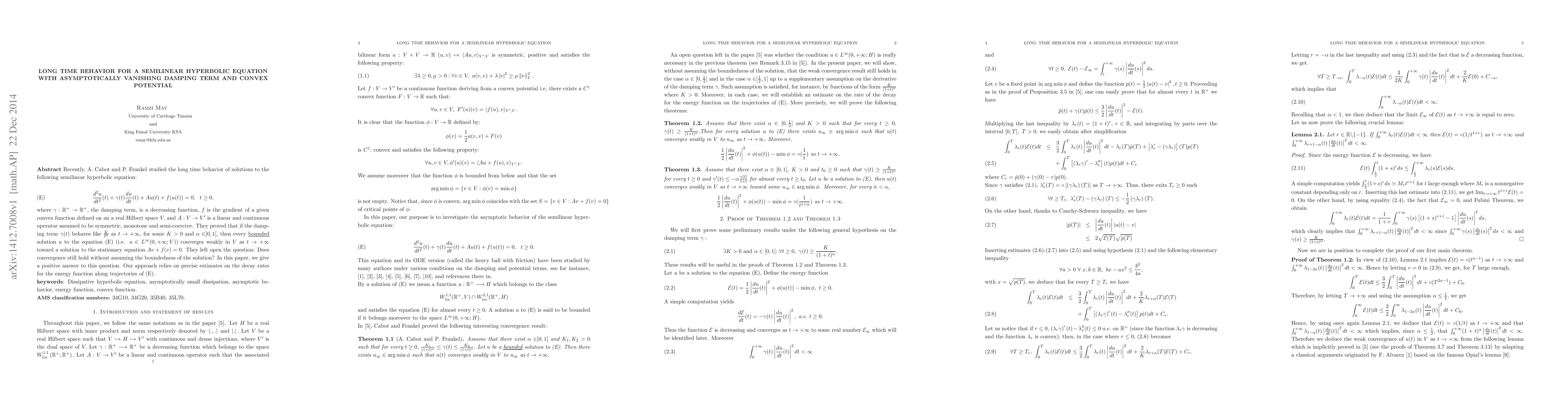A semilinear hyperbolic equation with asymptotically vanishing damping term and convex potential is analyzed for its long-time behavior. Global solutions converge weakly to an equilibrium point as time approaches infinity under certain conditions.
