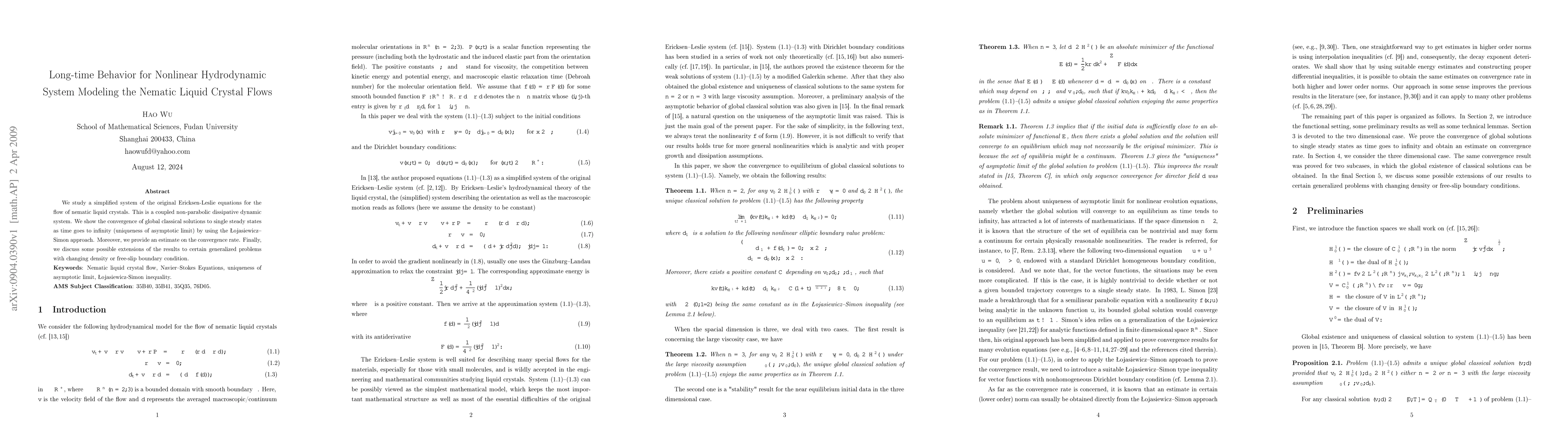 We study a simplified system of the original Ericksen--Leslie equations for the flow of nematic liquid crystals. This is a coupled non-parabolic dissipative dynamic system. We show the convergence of global classical solutions to single steady states as time goes to infinity (uniqueness of asymptotic limit) by using the \L ojasiewicz--Simon approach. Moreover, we provide an estimate on the convergence rate. Finally, we discuss some possible extensions of the results to certain generalized problems with changing density or free-slip boundary condition.