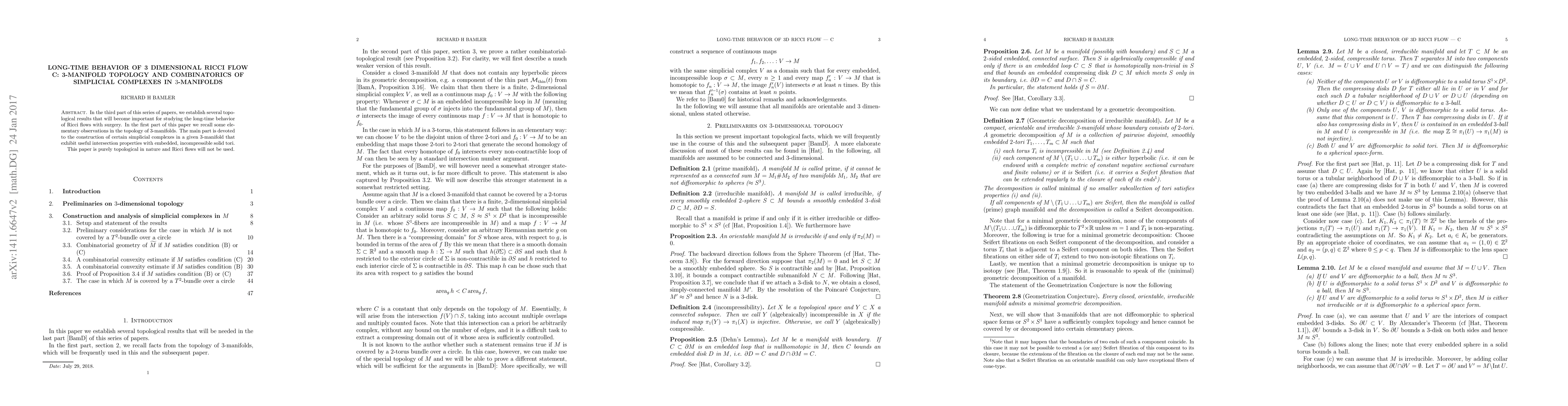In the third part of this series of papers, we establish several topological results that will become important for studying the long-time behavior of Ricci flows with surgery. In the first part of this paper we recall some elementary observations in the topology of 3-manifolds. The main part is devoted to the construction of certain simplicial complexes in a given 3-manifold that exhibit useful intersection properties with embedded, incompressible solid tori. This paper is purely topological in nature and Ricci flows will not be used.