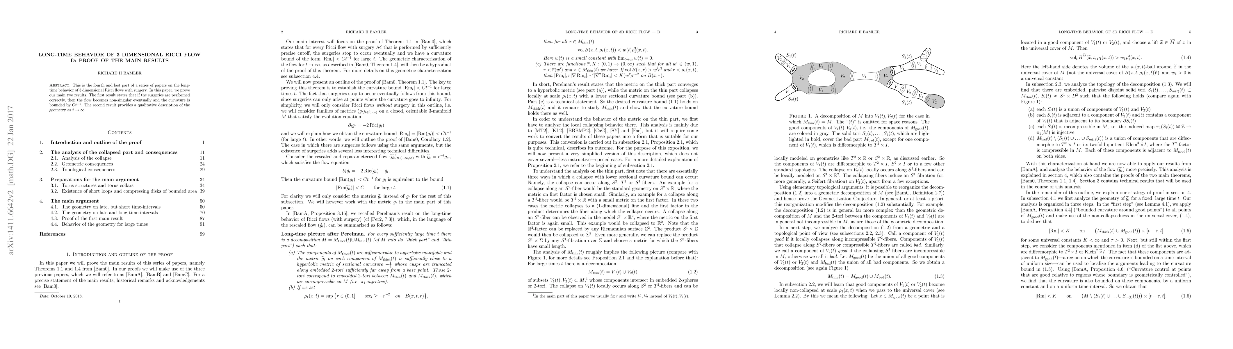 This paper proves that correctly performed surgeries in 3D Ricci flow lead to a non-singular flow with curvature bounded by C t^(-1), and offers a qualitative description of the resulting geometry as time tends to infinity.