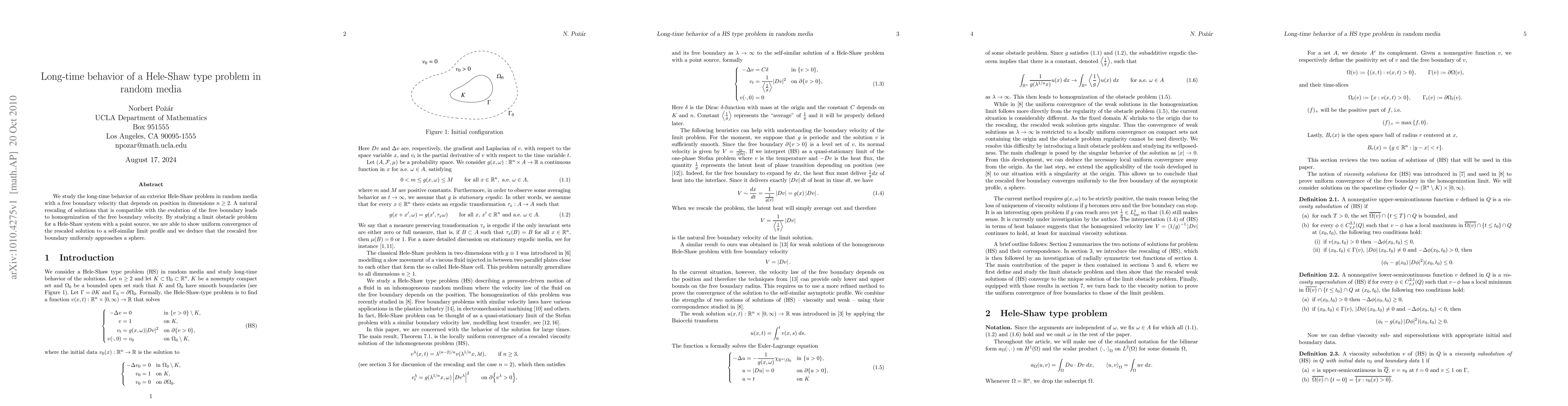 We study the long-time behavior of an exterior Hele-Shaw problem in random media with a free boundary velocity that depends on position in dimensions $n \geq 2$. A natural rescaling of solutions that is compatible with the evolution of the free boundary leads to homogenization of the free boundary velocity. By studying a limit obstacle problem for a Hele-Shaw system with a point source, we are able to show uniform convergence of the rescaled solution to a self-similar limit profile and we deduce that the rescaled free boundary uniformly approaches a sphere.