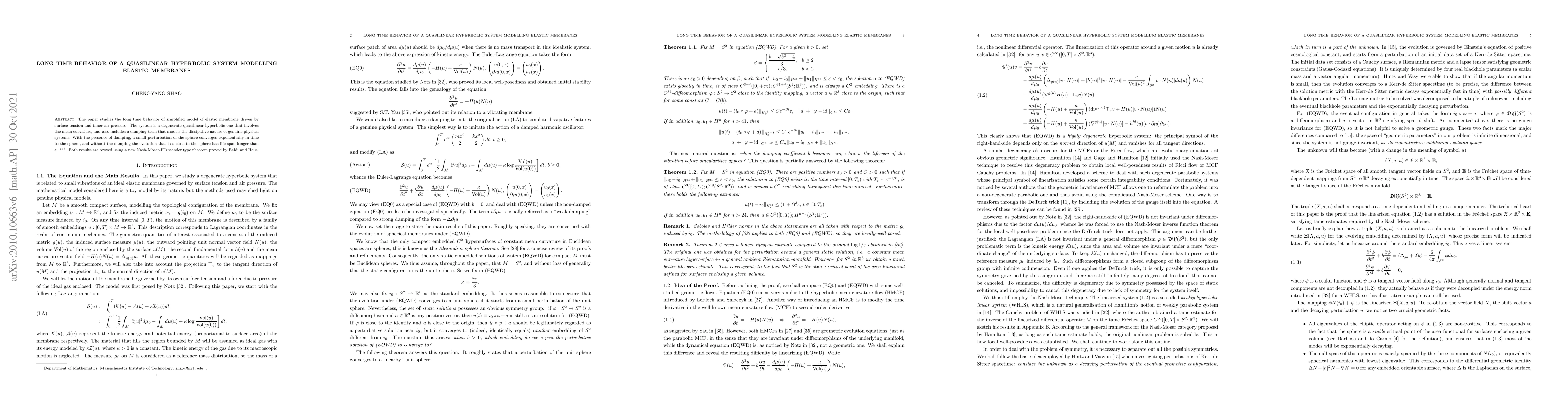 The paper studies the long time behavior of a system that describes the motion of a piece of elastic membrane driven by surface tension and inner air pressure. The system is a degenerate quasilinear hyperbolic one that involves the mean curvature, and also includes a damping term that models the dissipative nature of genuine physical systems. With the presence of damping, a small perturbation of the sphere converges exponentially in time to the sphere, and without the damping the evolution that is $\varepsilon$-close to the sphere has life span longer than $\varepsilon^{-1/6}$. Both results are proved using a new Nash-Moser-H\"{o}rmander type theorem proved by Baldi and Haus.