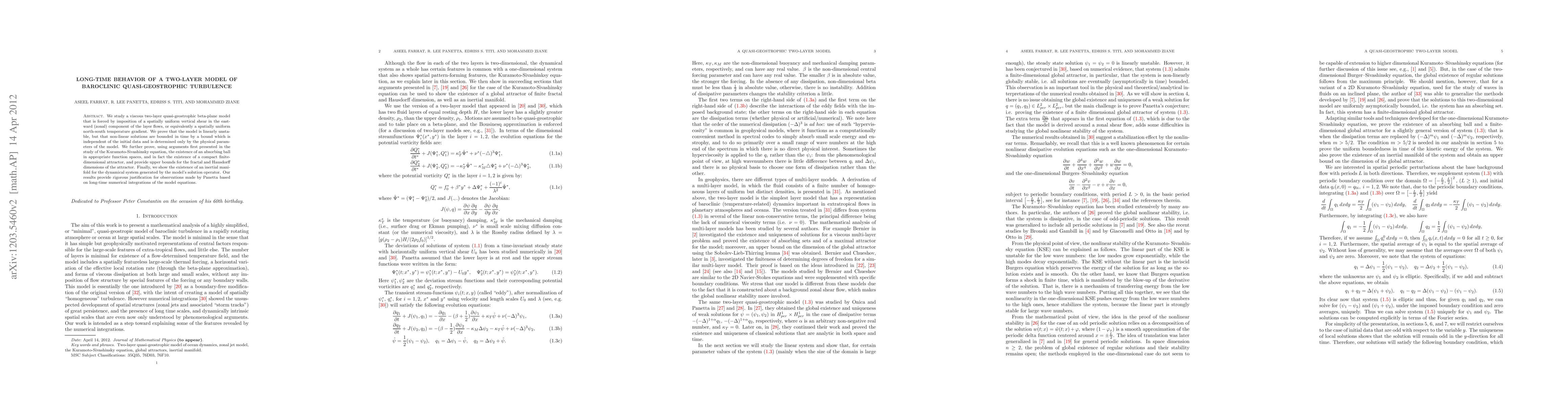 This paper investigates the long-term dynamics of a viscous two-layer quasi-geostrophic model, proving its linear instability but demonstrating bounded non-linear solutions. It establishes the existence of an absorbing set and a compact finite-dimensional attractor, along with an inertial manifold, supporting long-time numerical simulations.