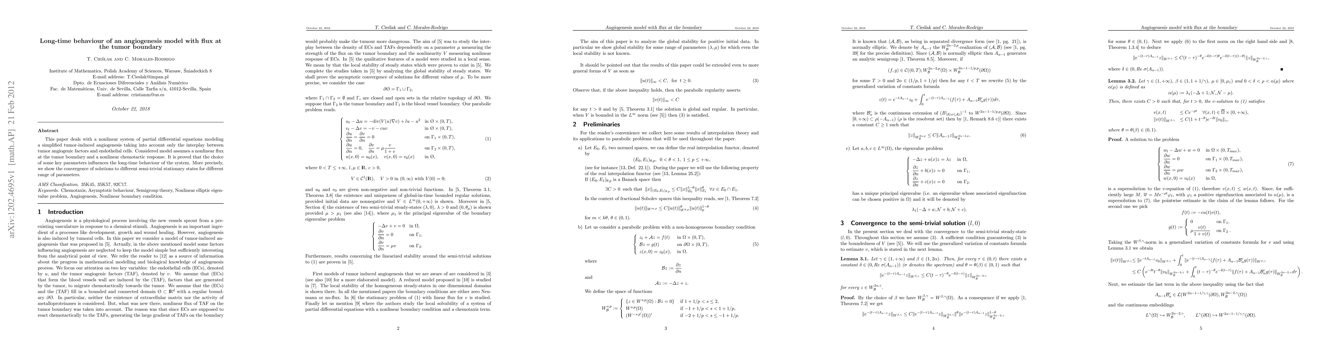 This paper models tumor-induced angiogenesis with a nonlinear flux at the tumor boundary and demonstrates convergence to different semi-trivial stationary states depending on chosen parameters.