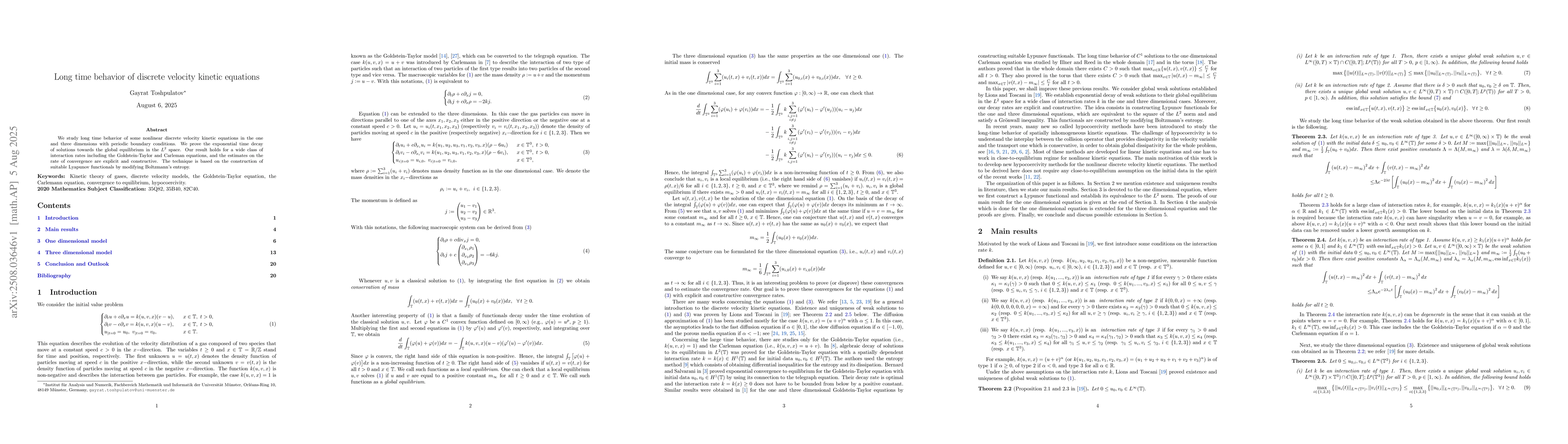 We study long time behavior of some nonlinear discrete velocity kinetic equations in the one and three dimensions with periodic boundary conditions. We prove the exponential time decay of solutions towards the global equilibrium in the $L^2$ space. Our result holds for a wide class of interaction rates including the Goldstein-Taylor and Carleman equations, and the estimates on the rate of convergence are explicit and constructive. The technique is based on the construction of suitable Lyapunov functionals by modifying Boltzmann's entropy.