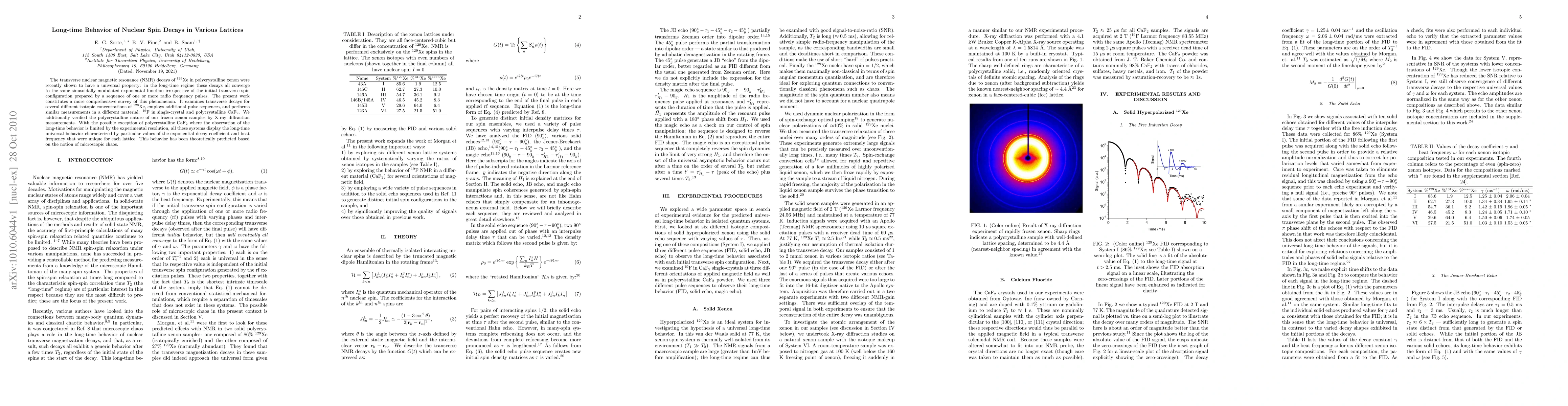 This research investigates the long-time behavior of nuclear spin decays in various lattices, finding that transverse decays of $^{129}$Xe and $^{19}$F converge to a universal sinusoidally modulated exponential function, with unique decay coefficients and beat frequencies for each lattice, supporting theoretical predictions of microscopic chaos.