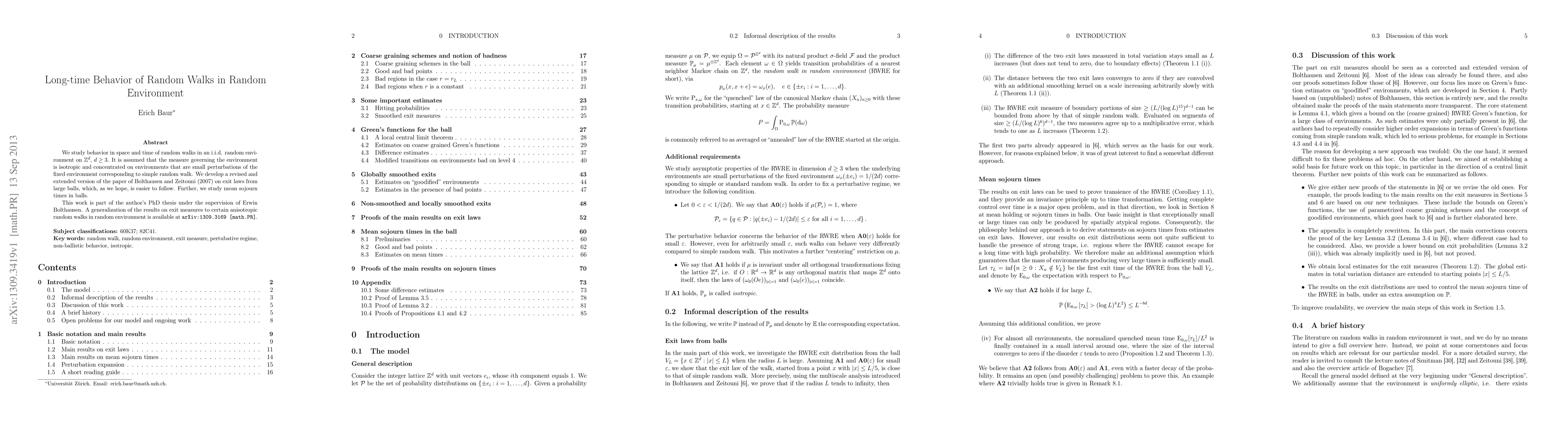 This paper investigates the long-term spatial and temporal behavior of random walks in an isotropic random environment on Z^d (d ≥ 3), focusing on exit laws from large balls and mean sojourn times, building on and extending the work of Bolthausen and Zeitouni. The study is part of a PhD thesis supervised by Erwin Bolthausen.