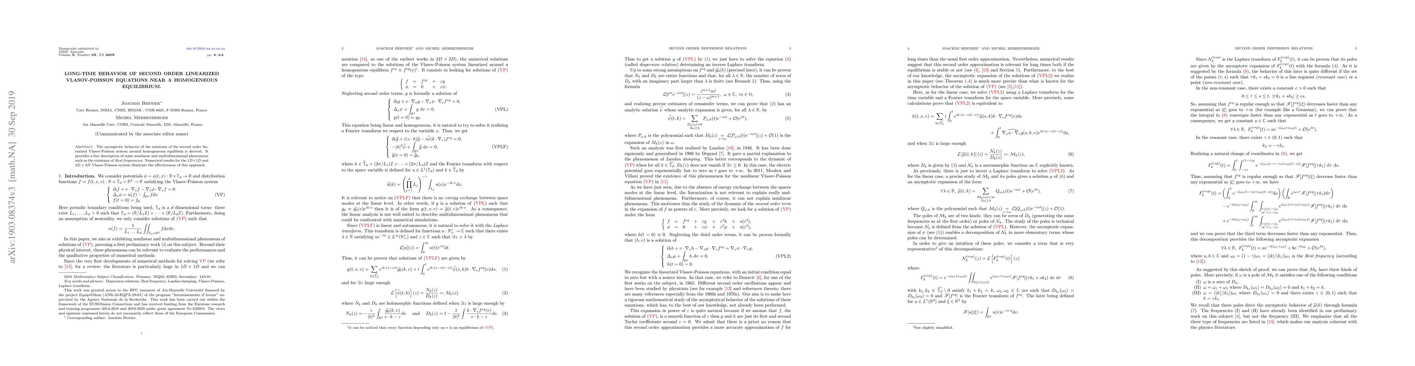 The asymptotic behavior of the solutions of the second order linearized Vlasov-Poisson system around homogeneous equilibria is derived. It provides a fine description of some nonlinear and multidimensional phenomena such as the existence of Best frequencies. Numerical results for the 1Dx1D and 2Dx2D Vlasov-Poisson system illustrate the effectiveness of this approach.
