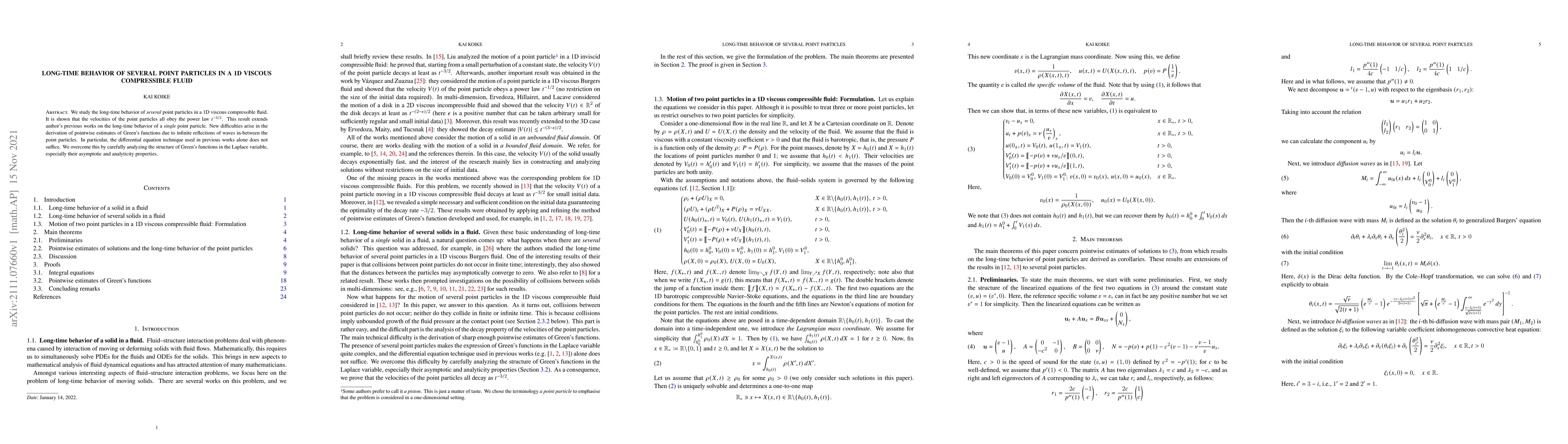 This paper investigates the long-term behavior of multiple point particles in a 1D viscous compressible fluid, demonstrating that their velocities follow a $t^{-3/2}$ power law. It extends prior studies on single particles and addresses new challenges in deriving Green's function estimates due to wave reflections between particles.