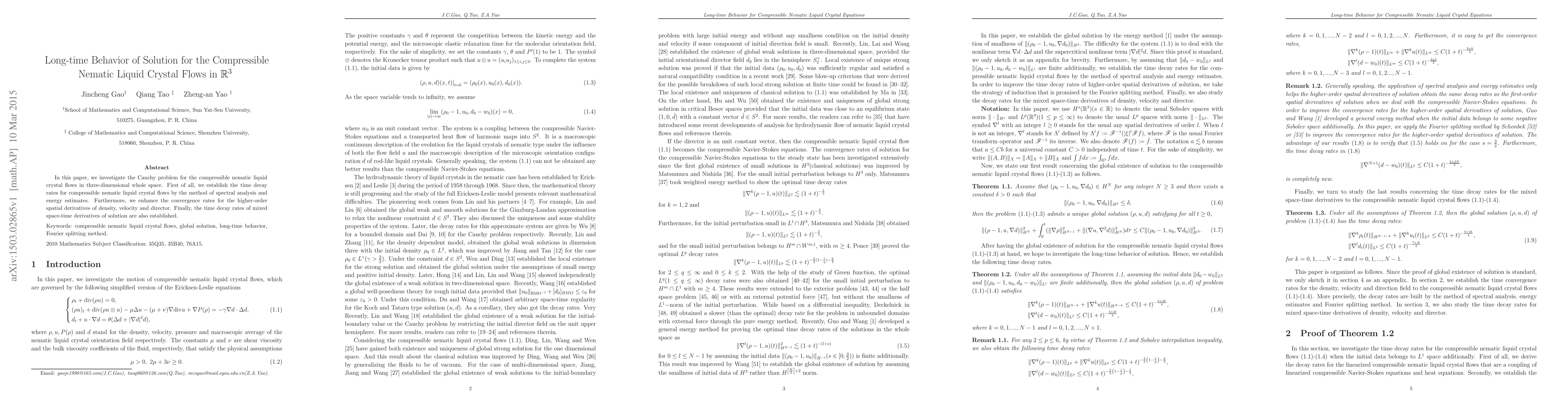 This paper investigates the long-time behavior of solution for compressible nematic liquid crystal flows in 3D space, establishing time decay rates for density, velocity, and director with enhanced convergence rates for higher-order derivatives.