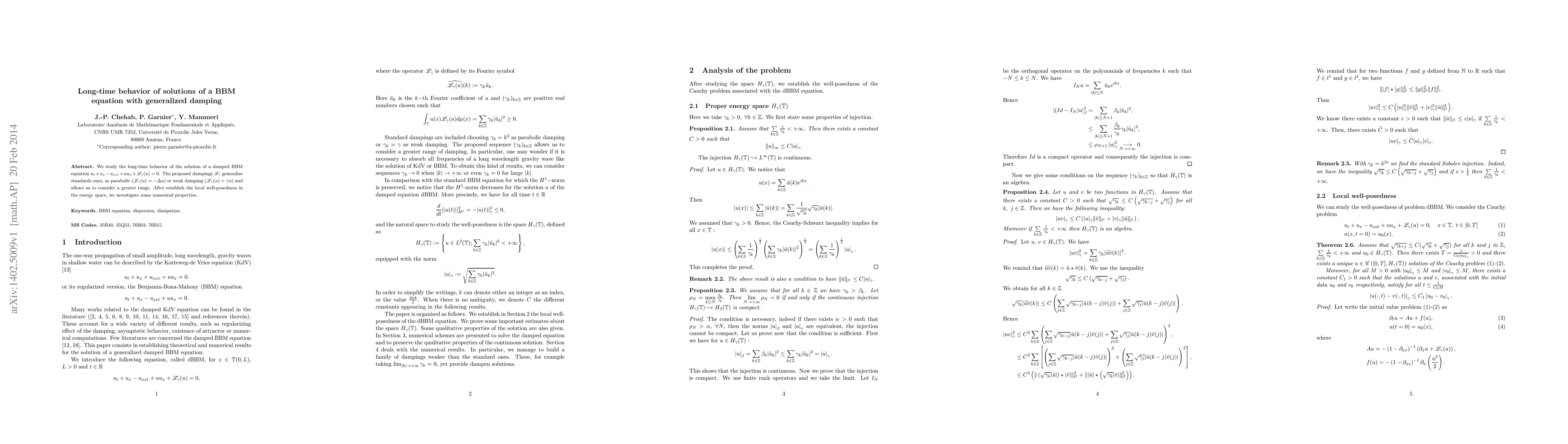 This research paper investigates the long-time behavior of solutions to a damped BBM equation with generalized damping, exploring its numerical properties and implications for various types of damping.
