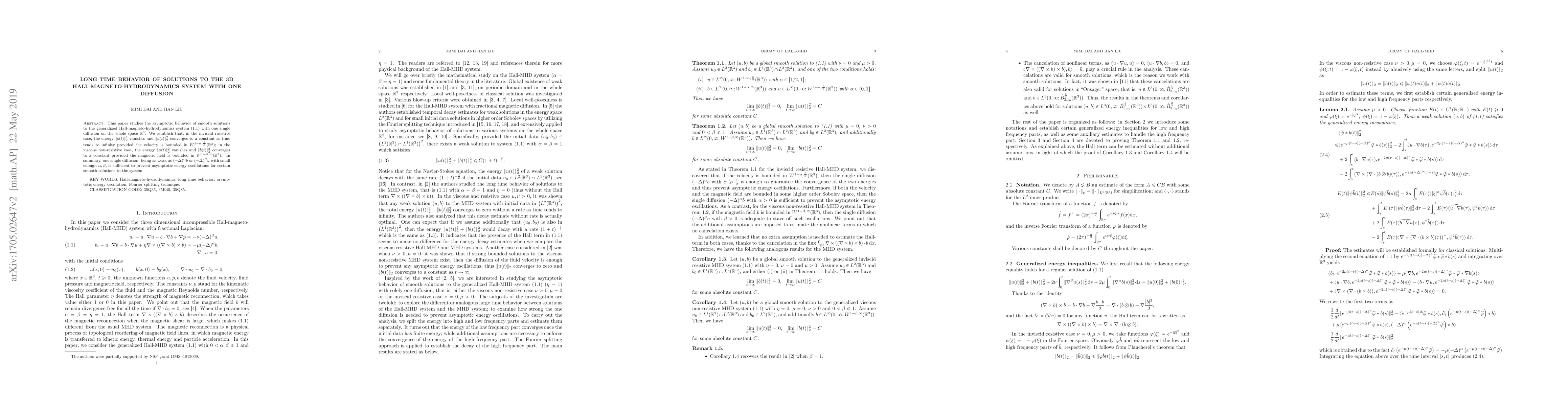 This paper investigates the long-term behavior of smooth solutions to the 3D Hall-magneto-hydrodynamics system with one diffusion, showing that in the inviscid resistive case, the magnetic field energy decays while the velocity energy converges to a constant, and in the viscous non-resistive case, the opposite occurs with the magnetic field.
