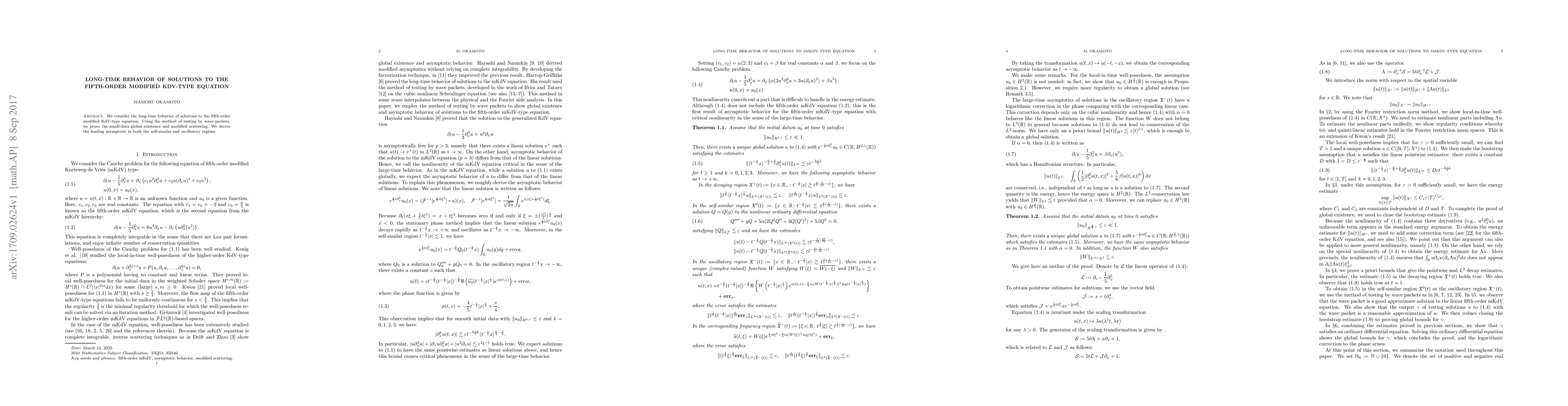 This paper investigates the long-term behavior of solutions to a fifth-order modified KdV-type equation, proving small-data global existence and modified scattering via wave packet analysis, and deriving leading asymptotic behaviors in both self-similar and oscillatory regions.