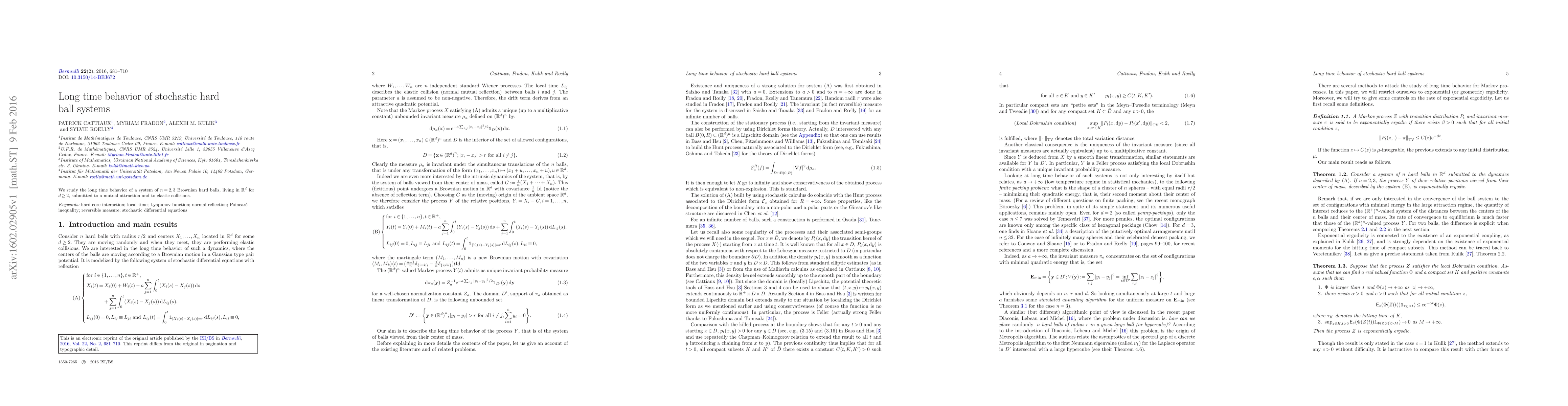 We study the long time behavior of a system of $n=2,3$ Brownian hard balls, living in $\mathbb{R}^d$ for $d\ge2$, submitted to a mutual attraction and to elastic collisions.