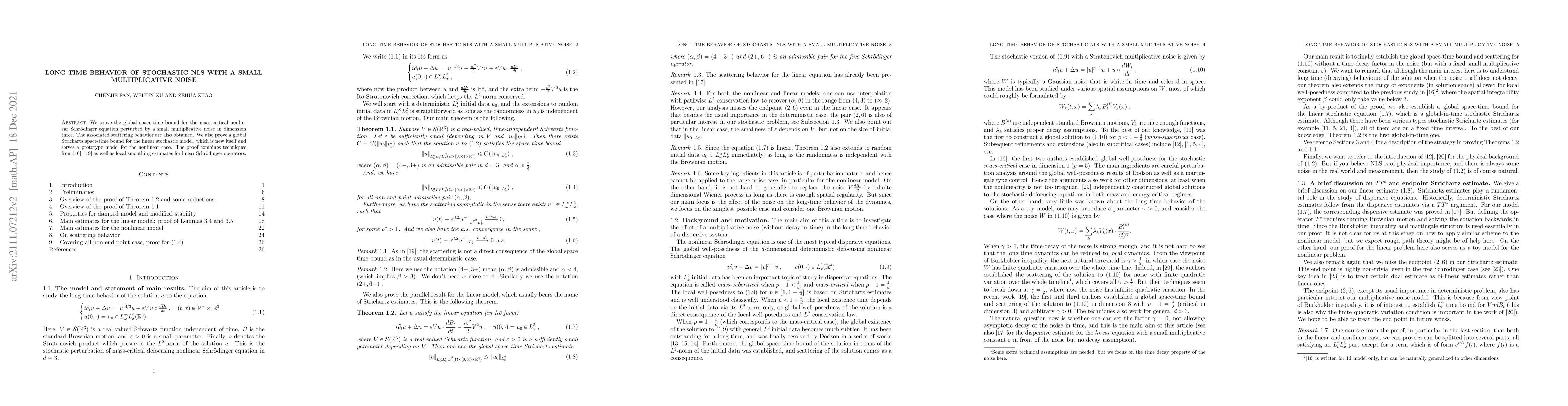 This paper establishes global space-time bounds for the mass critical nonlinear Schrödinger equation with a small multiplicative noise in three dimensions, proving associated scattering behavior. It also introduces a new global Strichartz space-time bound for the linear stochastic model, which serves as a prototype for the nonlinear case.