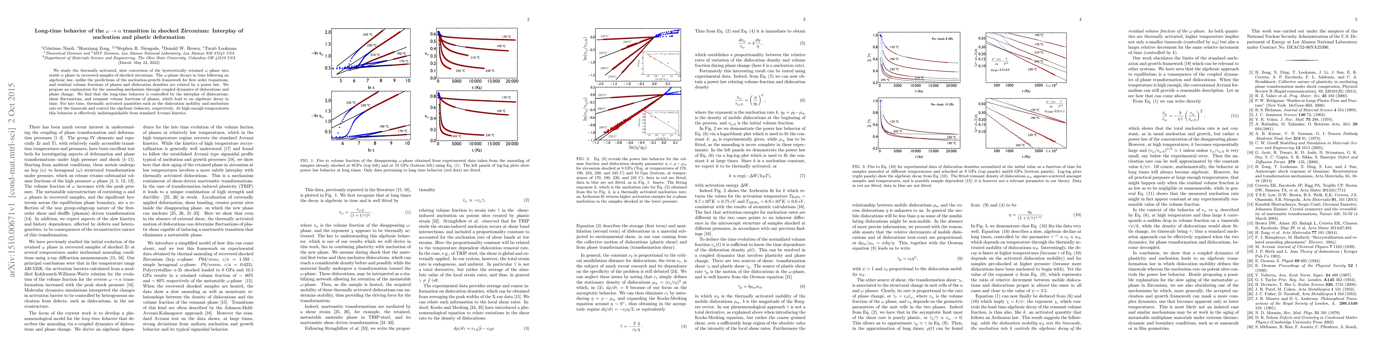 We study the thermally activated, slow conversion of the hysteretically retained $\omega$ phase into stable $\alpha$ phase in recovered samples of shocked zirconium. The $\omega$-phase decays in time following an algebraic law, unlike the predictions of the nucleation-growth framework for first order transitions, and residual volume fractions of phases and dislocation densities are related by a power law. We propose an explanation for the annealing mechanism through coupled dynamics of dislocations and phase change. We find that the long-time behavior is controlled by the interplay of dislocations, shear fluctuations, and remnant volume fractions of phases, which lead to an algebraic decay in time. For late time, thermally activated quantities such as the dislocation mobility and nucleation rate set the timescale and control the algebraic behavior, respectively. At high enough temperatures this behavior is effectively indistinguishable from standard Avrami kinetics.