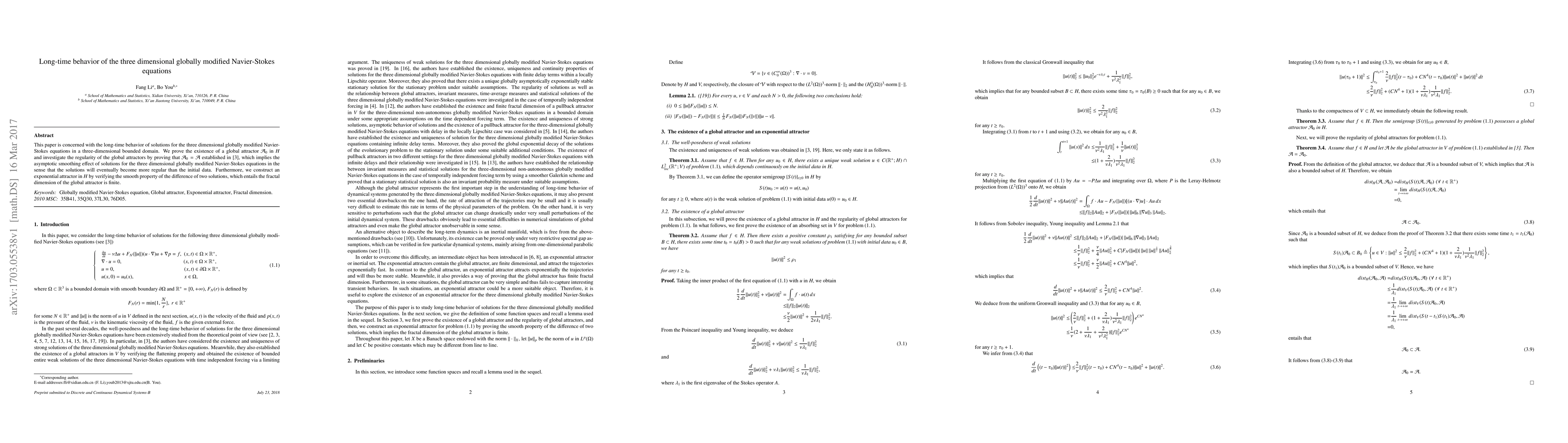 This paper investigates the long-term behavior of solutions to the three-dimensional globally modified Navier-Stokes equations, proving the existence of a global attractor $\mathcal{A}_0$ in $H$ that exhibits an asymptotic smoothing effect. The study also constructs an exponential attractor, confirming the finite fractal dimension of the global attractor.