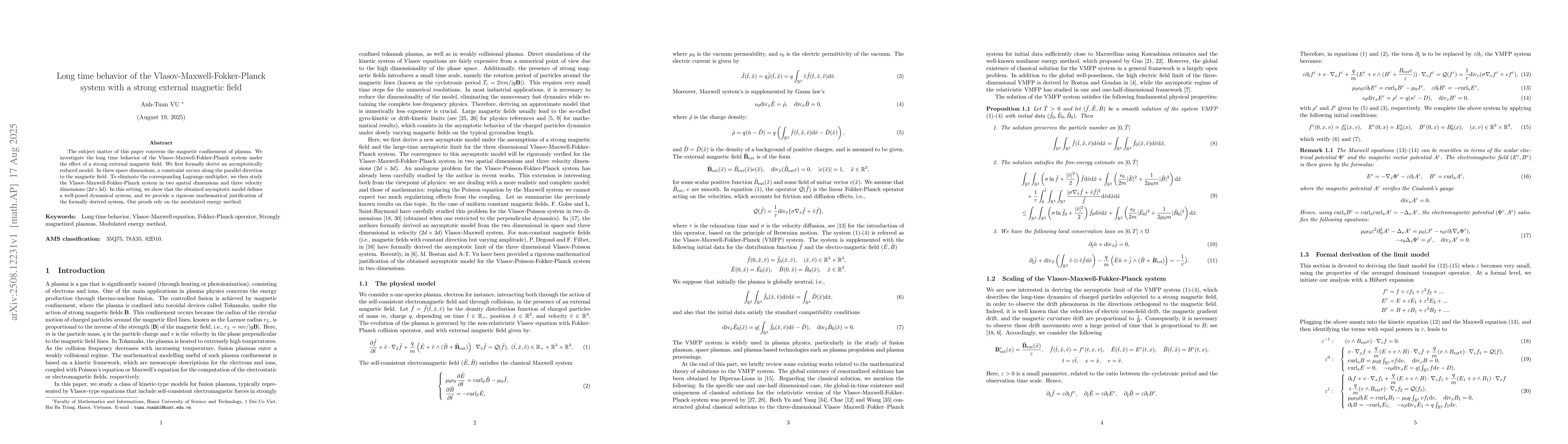 The subject matter of this paper concerns the magnetic confinement of plasma. We investigate the long time behavior of the Vlasov-Maxwell-Fokker-Planck system under the effect of a strong external magnetic field. We first formally derive an asymptotically reduced model. In three space dimensions, a constraint occurs along the parallel direction to the magnetic field. To eliminate the corresponding Lagrange multiplier, we then study the Vlasov-Maxwell-Fokker-Planck system in two spatial dimensions and three velocity dimensions. In this setting, we show that the obtained asymptotic model defines a well-posed dynamical system, and we provide a rigorous mathematical justification of the formally derived system. Our proofs rely on the modulated energy method.