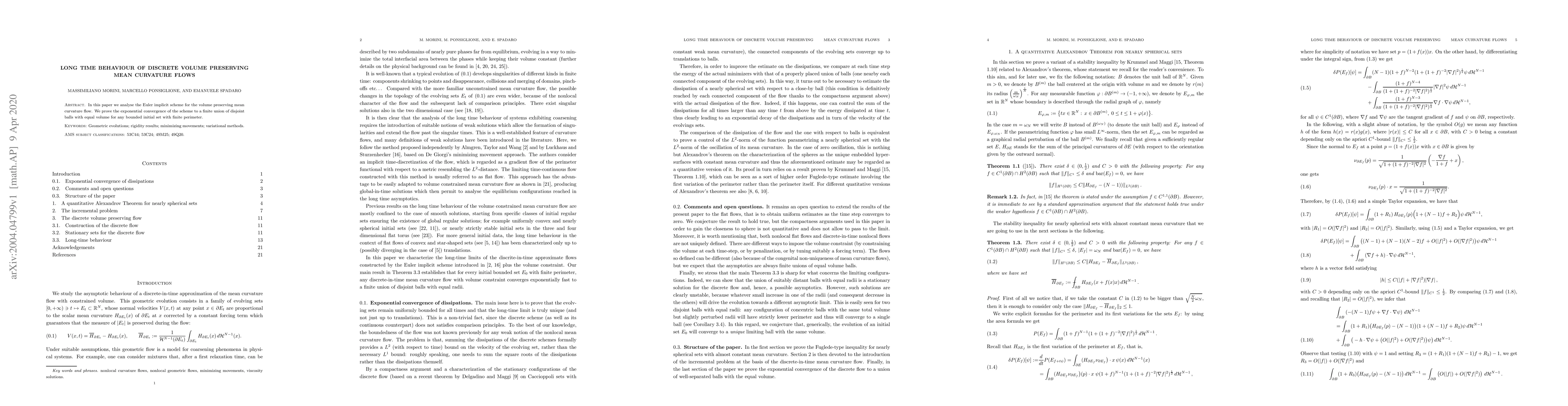 This paper investigates the Euler implicit scheme for volume preserving mean curvature flow, demonstrating its exponential convergence to a finite collection of disjoint balls of equal volume, given any bounded initial set of finite perimeter.