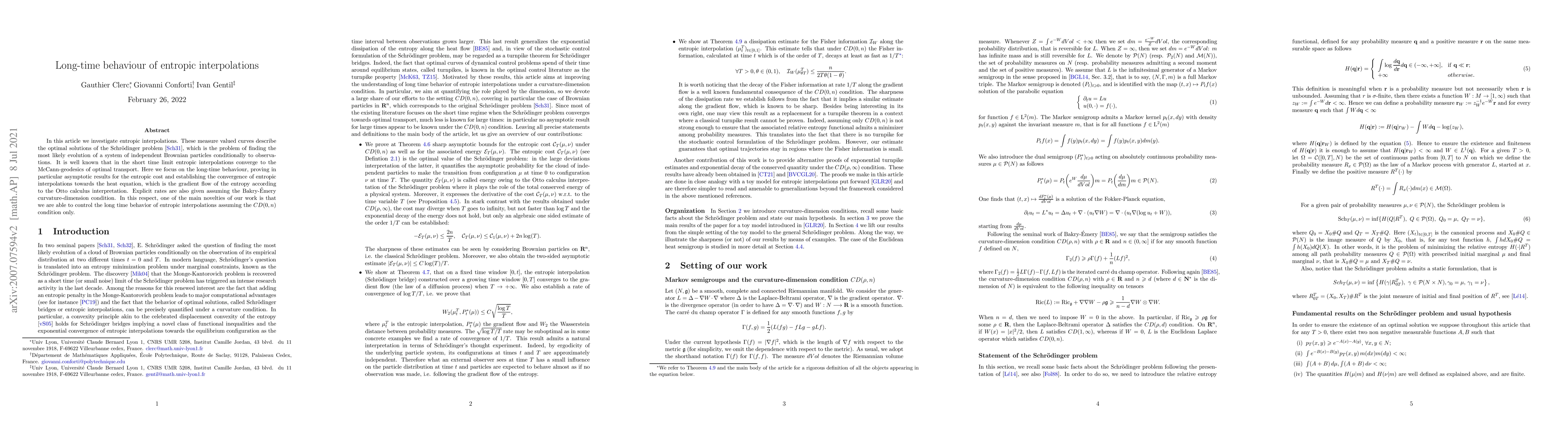 In this article we investigate entropic interpolations. These measure valued curves describe the optimal solutions of the Schr{\"o}dinger problem [Sch31], which is the problem of finding the most likely evolution of a system of independent Brownian particles conditionally to observations. It is well known that in the short time limit entropic interpolations converge to the McCann-geodesics of optimal transport. Here we focus on the long-time behaviour, proving in particular asymptotic results for the entropic cost and establishing the convergence of entropic interpolations towards the heat equation, which is the gradient flow of the entropy according to the Otto calculus interpretation. Explicit rates are also given assuming the Bakry-{\'E}mery curvature-dimension condition. In this respect, one of the main novelties of our work is that we are able to control the long time behavior of entropic interpolations assuming the CD(0, n) condition only.