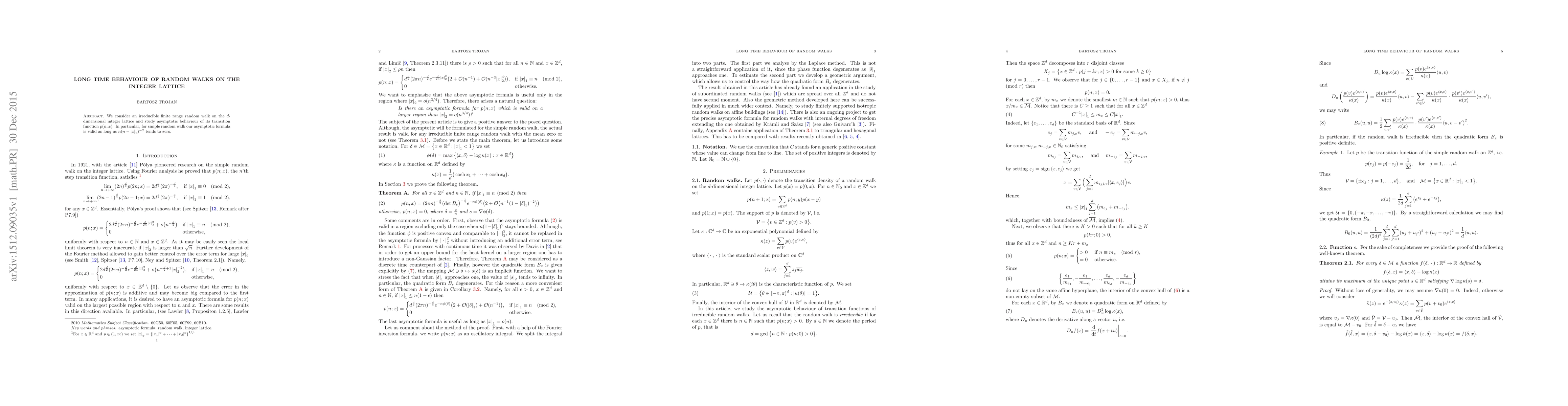 We consider an irreducible finite range random walk on the $d$-dimensional integer lattice and study asymptotic behaviour of its transition function $p(n; x)$. In particular, for simple random walk our asymptotic formula is valid as long as $n (n - |x|_1)^{-2}$ tends to zero.