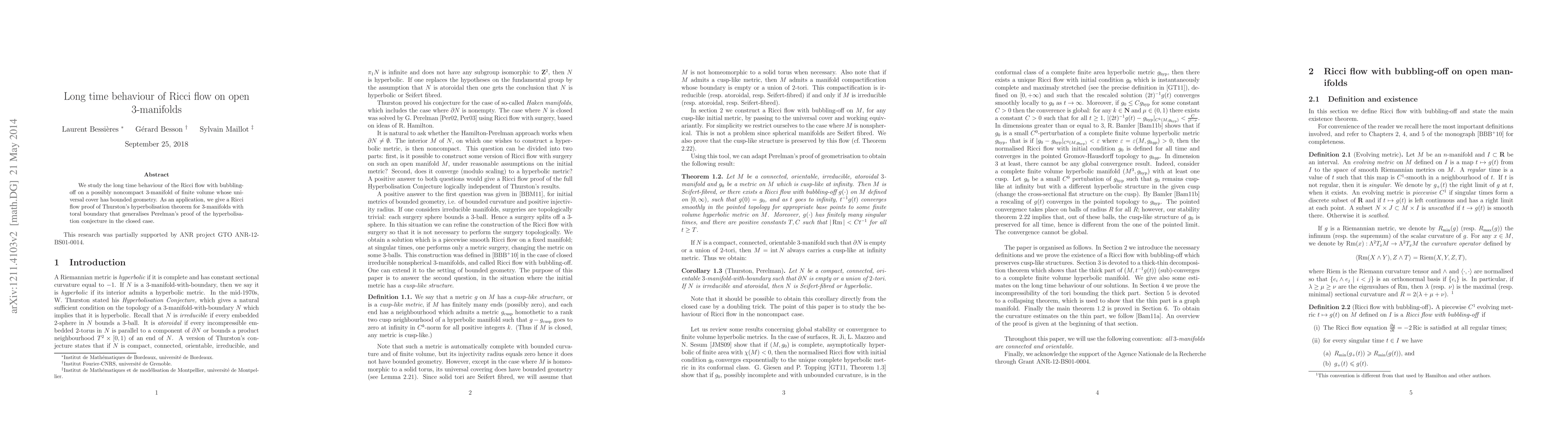 This paper investigates the long-term behavior of Ricci flow on open 3-manifolds with finite volume and bounded geometry, proving Thurston's hyperbolisation theorem using Ricci flow, extending Perelman's closed case proof.