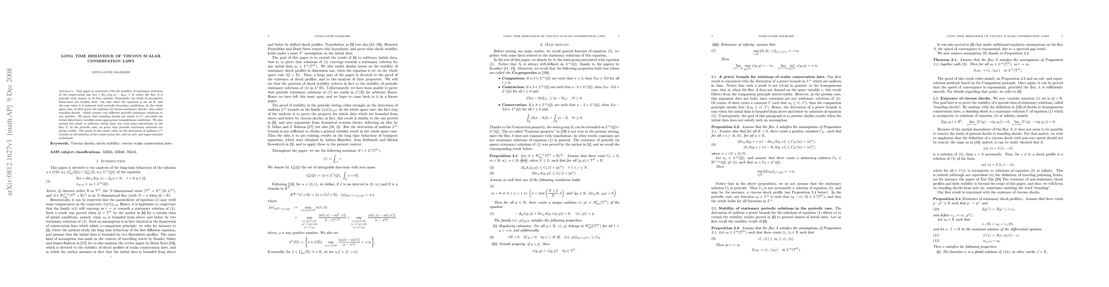 This paper is concerned with the stability of stationary solutions of the conservation law $\partial_t u + \mathrm{div}_y A(y,u) -\Delta_y u=0$, where the flux $A$ is periodic with respect to its first variable. Essentially two kinds of asymptotic behaviours are studied here: the case when the equation is set on $\R$, and the case when it is endowed with periodic boundary conditions. In the whole space case, we first prove the existence of viscous stationary shocks - also called standing shocks - which connect two different periodic stationary solutions to one another. We prove that standing shocks are stable in $L^1$, provided the initial disturbance satisfies some appropriate boundedness conditions. We also extend this result to arbitrary initial data, but with some restrictions on the flux $A$. In the periodic case, we prove that periodic stationary solutions are always stable. The proof of this result relies on the derivation of uniform $L^\infty$ bounds on the solution of the conservation law, and on sub- and super-solution techniques.