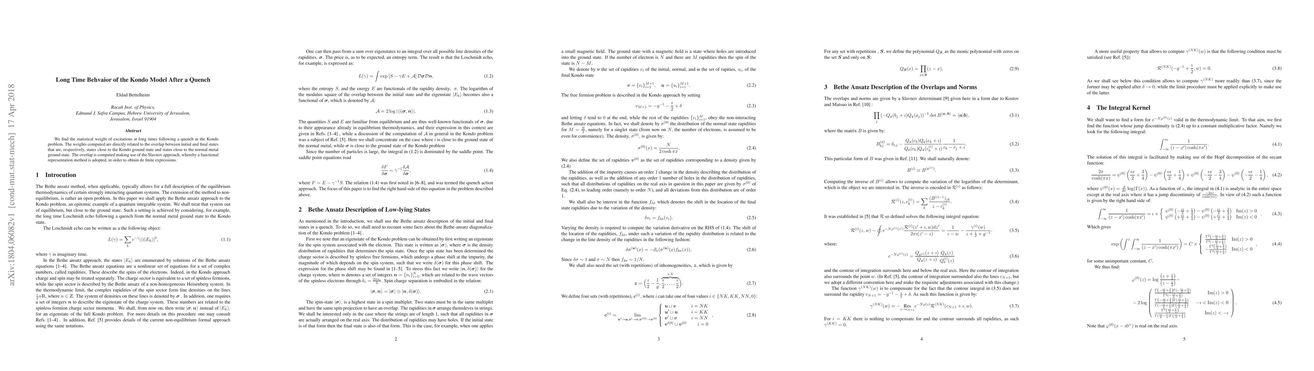 This paper investigates the statistical behavior of excitations in the Kondo model after a quench, revealing the overlap between initial and final states using the Slavnov approach for functional representation. The findings provide insights into the long-time dynamics following the quench.