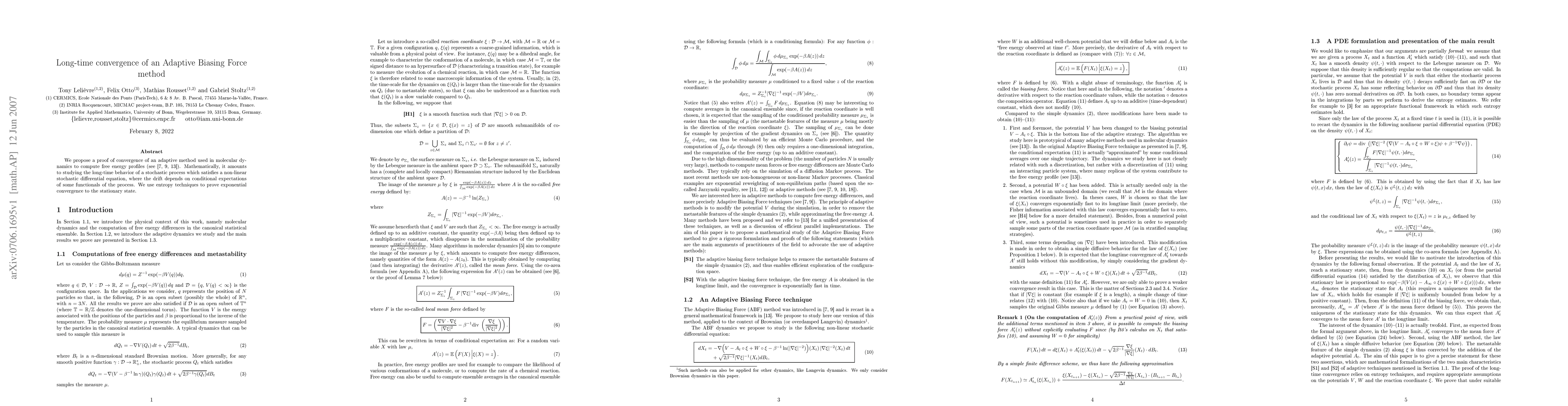 This paper proves the long-time convergence of an adaptive method in molecular dynamics for computing free energy profiles, demonstrating exponential convergence to the stationary state using entropy techniques. The method involves a stochastic process governed by a non-linear stochastic differential equation with adaptive drift.