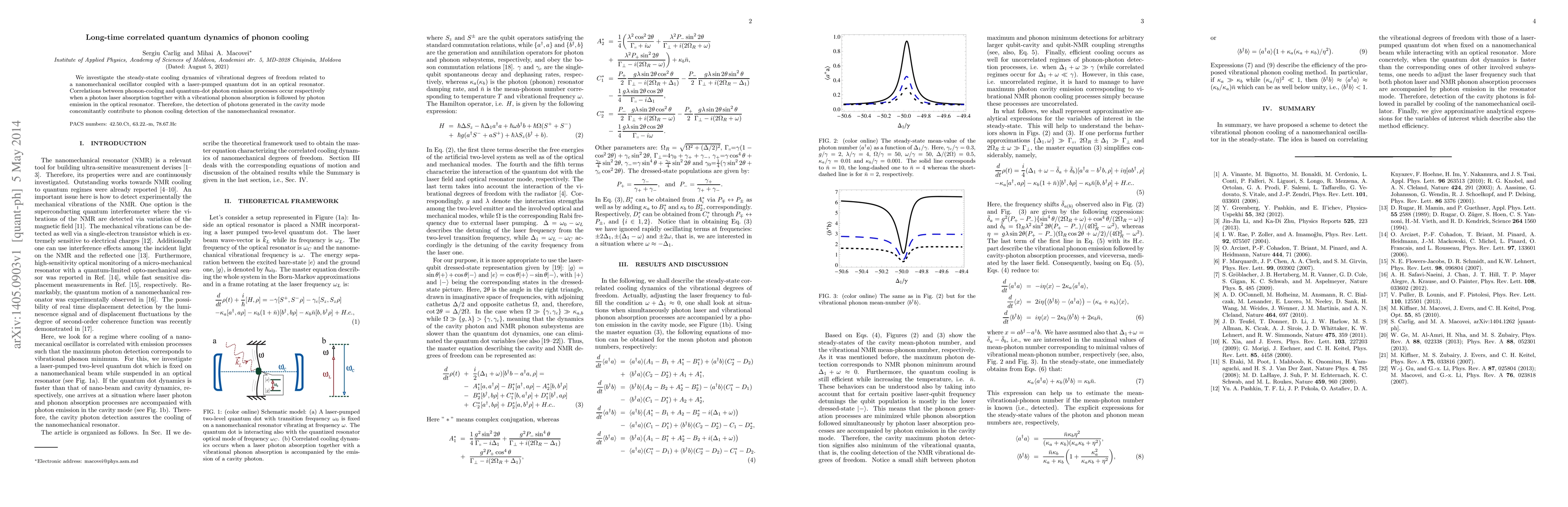 We investigate the steady-state cooling dynamics of vibrational degrees of freedom related to a nanomechanical oscillator coupled with a laser-pumped quantum dot in an optical resonator. Correlations between phonon-cooling and quantum-dot photon emission processes occur respectively when a photon laser absorption together with a vibrational phonon absorption is followed by photon emission in the optical resonator. Therefore, the detection of photons generated in the cavity mode concomitantly contribute to phonon cooling detection of the nanomechanical resonator.