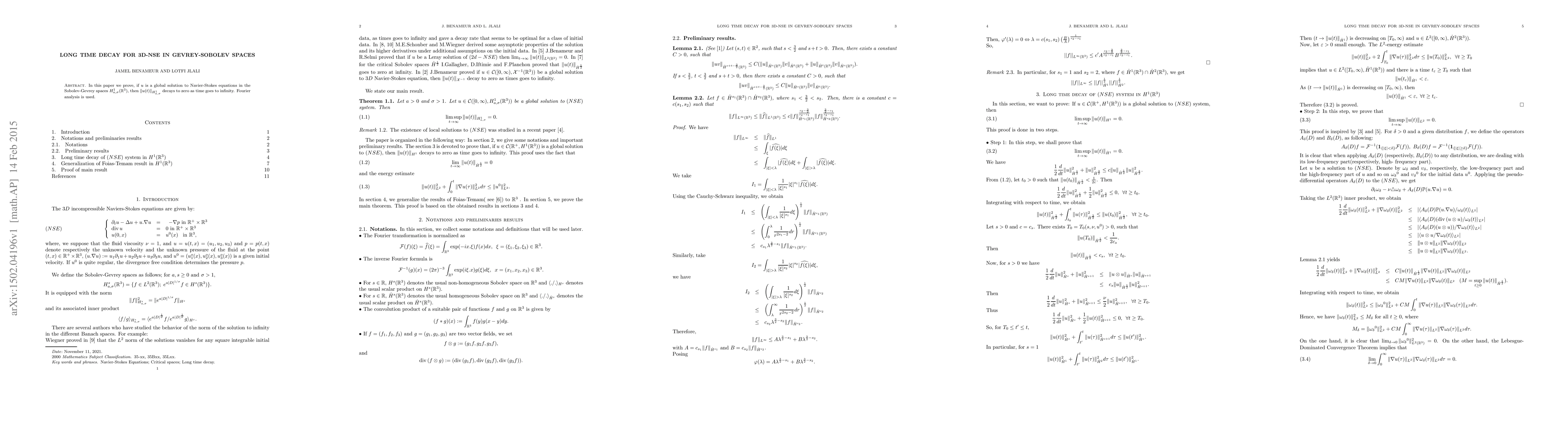 In this paper we prove, if $u$ is a global solution to Navier-Stokes equations in the Sobolev-Gevrey spaces $H^1_{a,\sigma}(\mathbb R^3)$, then $\|u(t)\|_{H^1_{a,\sigma}}$ decays to zero as time goes to infinity. Fourier analysis is used.