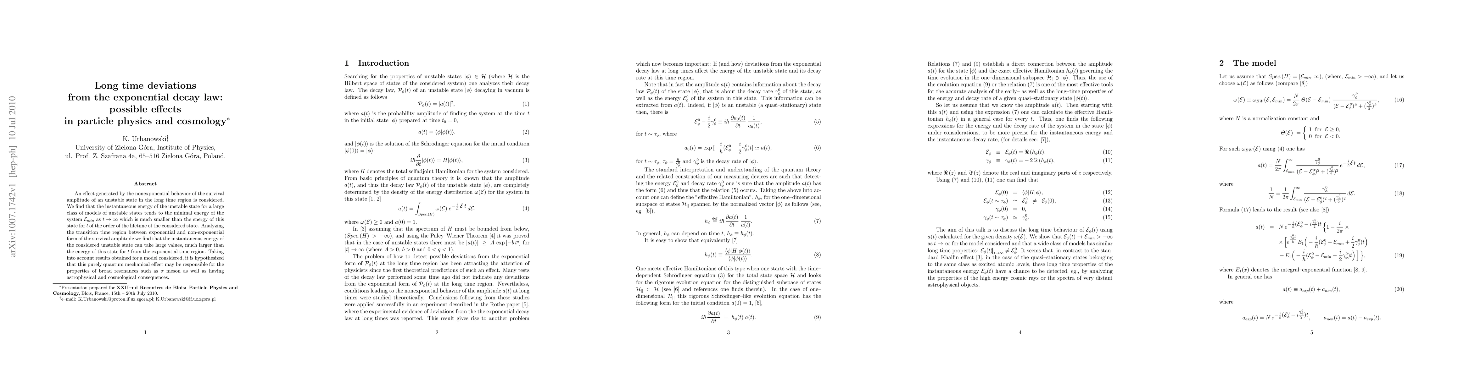An effect generated by the nonexponential behavior of the survival amplitude of an unstable state in the long time region is considered. We find that the instantaneous energy of the unstable state for a large class of models of unstable states tends to the minimal energy of the system ${\cal E}_{min}$ as $t\rightarrow\infty$ which is much smaller than the energy of this state for $t$ of the order of the lifetime of the considered state. Analyzing the transition time region between exponential and non-exponential form of the survival amplitude we find that the instantaneous energy of the considered unstable state can take large values, much larger than the energy of this state for $t$ from the exponential time region. Taking into account results obtained for a model considered, it is hypothesized that this purely quantum mechanical effect may be responsible for the properties of broad resonances such as $\sigma$ meson as well as having astrophysical and cosmological consequences.
