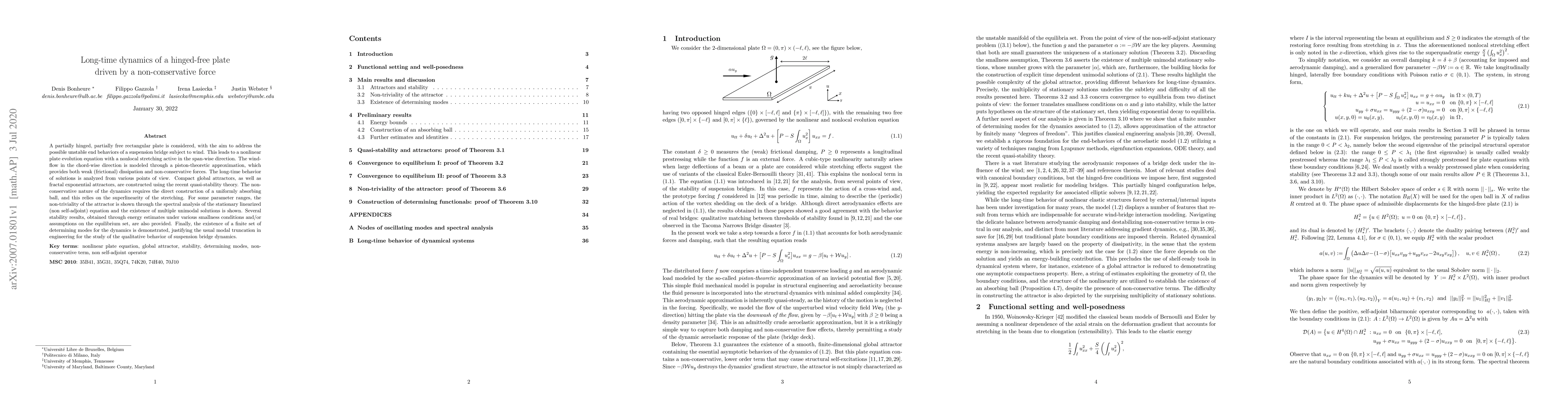 Researchers studied a hinged-free plate driven by a non-conservative force to understand its long-time behavior, finding compact global attractors and fractal exponential attractors with implications for suspension bridge dynamics.