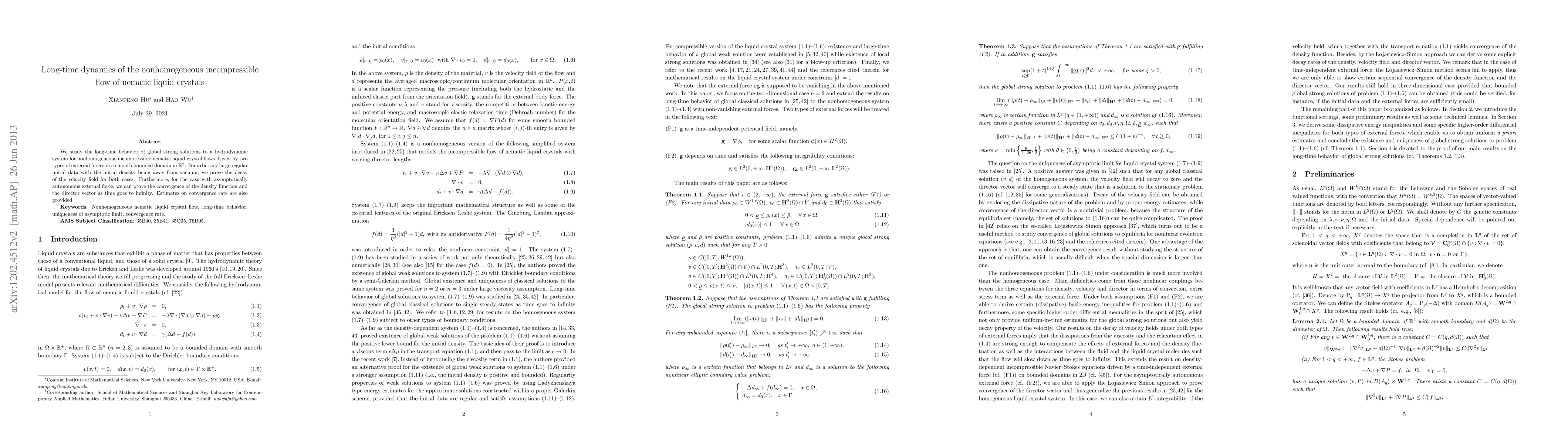 We study the long-time behavior of global strong solutions to a hydrodynamic system for nonhomogeneous incompressible nematic liquid crystal flows driven by two types of external forces in a smooth bounded domain in $\mathbb{R}^2$. For arbitrary large regular initial data with the initial density being away from vacuum, we prove the decay of the velocity field for both cases. Furthermore, for the case with asymptotically autonomous external force, we can prove the convergence of the density function and the director vector as time goes to infinity. Estimates on convergence rate are also provided.