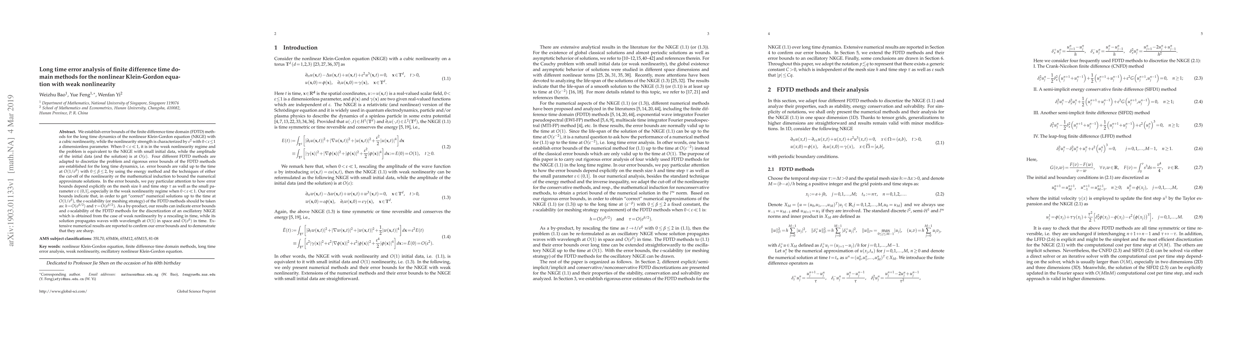 This paper establishes error bounds for finite difference time domain (FDTD) methods applied to the long-time dynamics of the nonlinear Klein-Gordon equation with weak nonlinearity. The study shows that for small nonlinearity parameters, the FDTD methods should scale the mesh size and time step proportionally to $\varepsilon^{\beta/2}$ to maintain accurate numerical solutions up to $O(1/\varepsilon^{\beta})$, where $0 \le \beta \leq 2$.