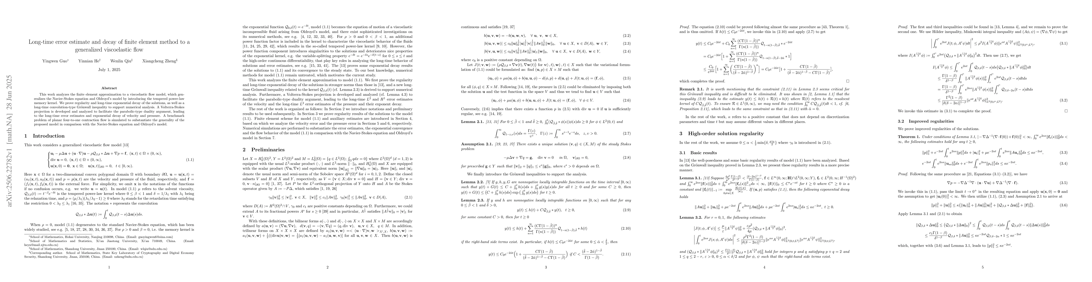 This work analyzes the finite element approximation to a viscoelastic flow model, which generalizes the Navier-Stokes equation and Oldroyd's model by introducing the tempered power-law memory kernel. We prove regularity and long-time exponential decay of the solutions, as well as a long-time convolution-type Gr\"onwall inequality to support numerical analysis. A Volterra-Stokes projection is developed and analyzed to facilitate the parabolic-type duality argument, leading to the long-time error estimates and exponential decay of velocity and pressure. A benchmark problem of planar four-to-one contraction flow is simulated to substantiate the generality of the proposed model in comparison with the Navier-Stokes equation and Oldroyd's model.