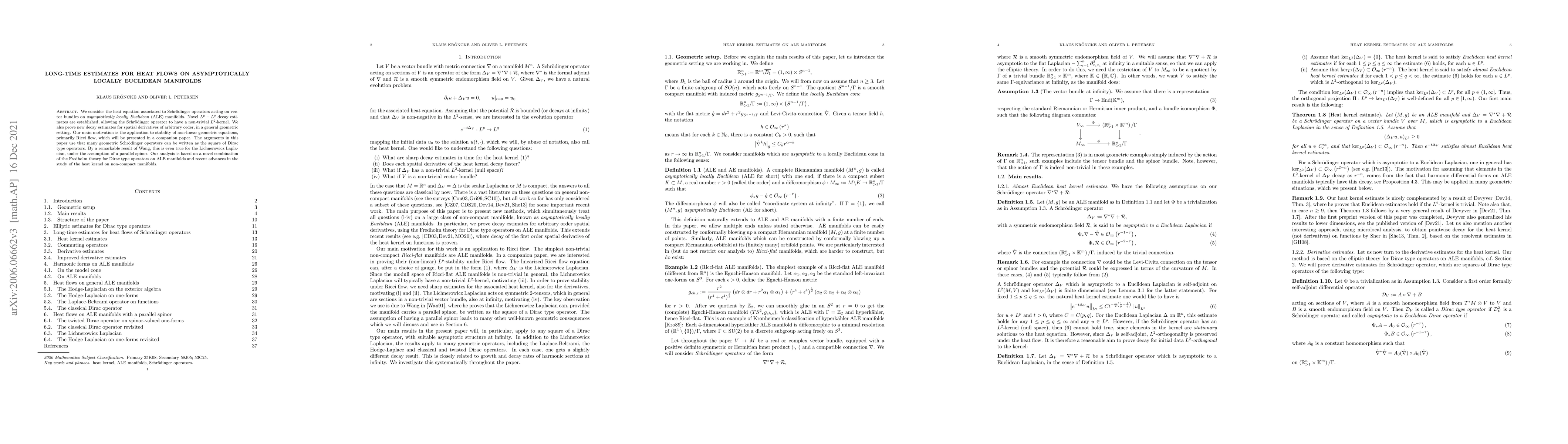 We consider the heat equation associated to Schr\"{o}dinger operators acting on vector bundles on asymptotically locally Euclidean (ALE) manifolds. Novel $L^p - L^q$ decay estimates are established, allowing the Schr\"{o}dinger operator to have a non-trivial $L^2$-kernel. We also prove new decay estimates for spatial derivatives of arbitrary order, in a general geometric setting. Our main motivation is the application to stability of non-linear geometric equations, primarily Ricci flow, which will be presented in a companion paper. The arguments in this paper use that many geometric Schr\"{o}dinger operators can be written as the square of Dirac type operators. By a remarkable result of Wang, this is even true for the Lichnerowicz Laplacian, under the assumption of a parallel spinor. Our analysis is based on a novel combination of the Fredholm theory for Dirac type operators on ALE manifolds and recent advances in the study of the heat kernel on non-compact manifolds.