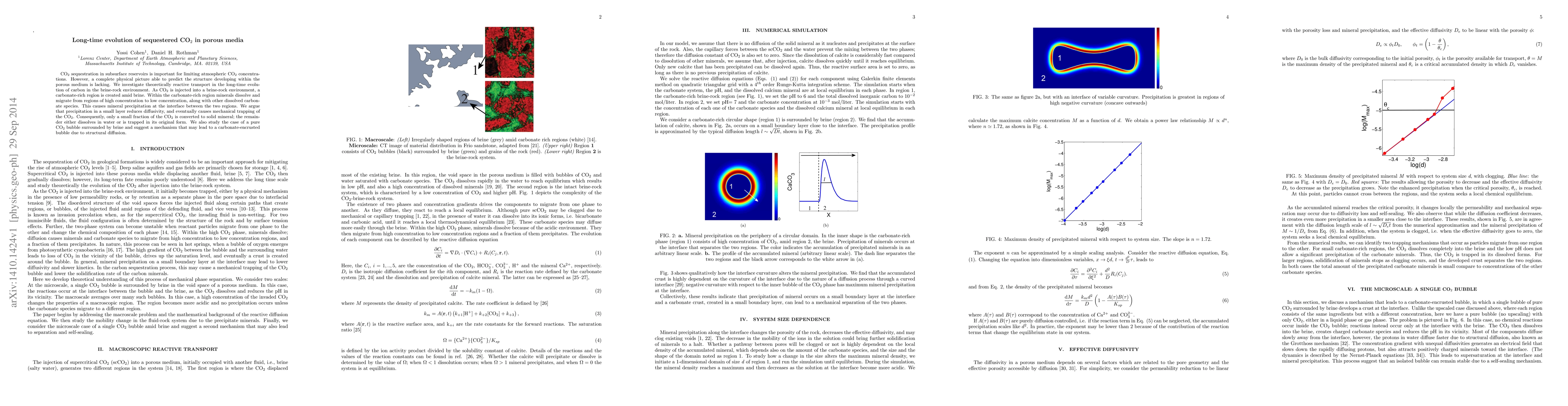 CO$_2$ sequestration in subsurface reservoirs is important for limiting atmospheric CO$_2$ concentrations. However, a complete physical picture able to predict the structure developing within the porous medium is lacking. We investigate theoretically reactive transport in the long-time evolution of carbon in the brine-rock environment. As CO$_2$ is injected into a brine-rock environment, a carbonate-rich region is created amid brine. Within the carbonate-rich region minerals dissolve and migrate from regions of high concentration to low concentration, along with other dissolved carbonate species. This causes mineral precipitation at the interface between the two regions. We argue that precipitation in a small layer reduces diffusivity, and eventually causes mechanical trapping of the CO$_2$. Consequently, only a small fraction of the CO$_2$ is converted to solid mineral; the remainder either dissolves in water or is trapped in its original form. We also study the case of a pure CO$_2$ bubble surrounded by brine and suggest a mechanism that may lead to a carbonate-encrusted bubble due to structural diffusion.