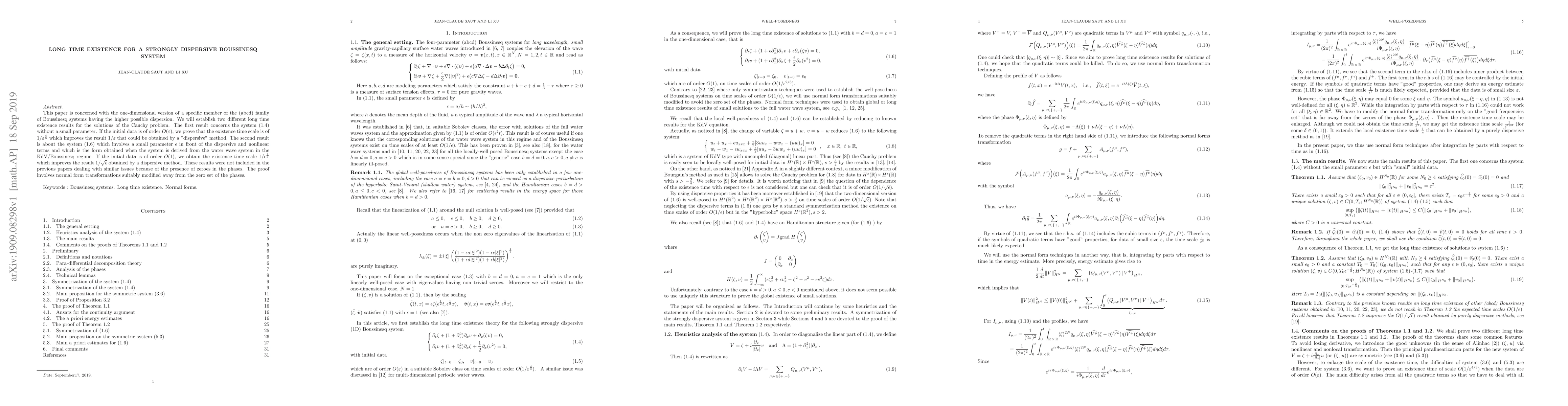 This paper investigates the long-time existence of solutions for a strongly dispersive one-dimensional Boussinesq system, establishing two distinct results using modified normal form transformations away from the zero set of the phases.