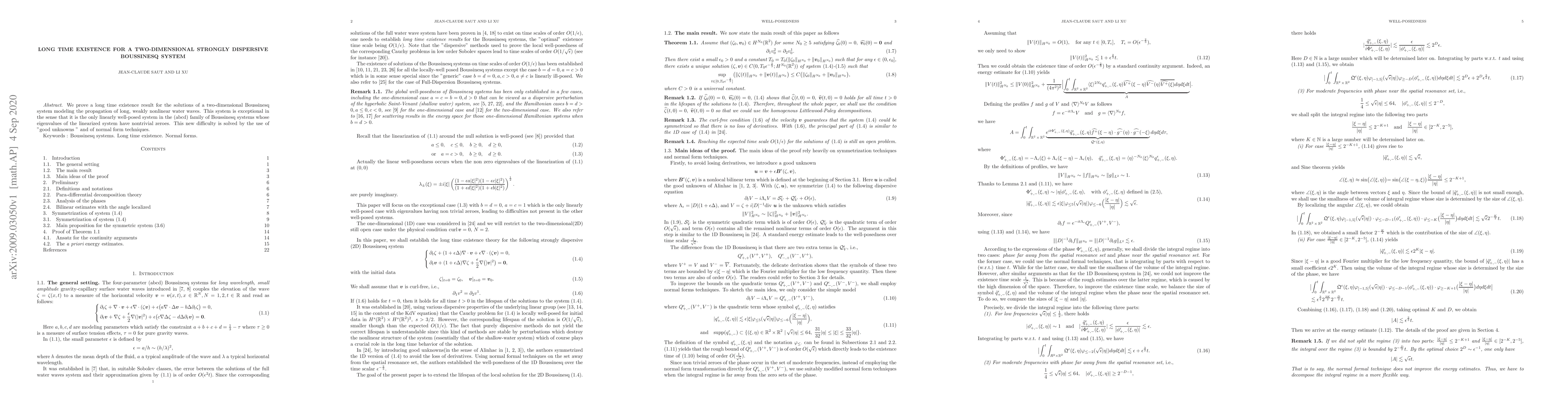 Summary: This paper establishes long-time existence of solutions for a two-dimensional Boussinesq system modeling weakly nonlinear water waves, using novel techniques involving "good unknowns" and normal form methods to address the unique challenge posed by the system's zero eigenvalues.