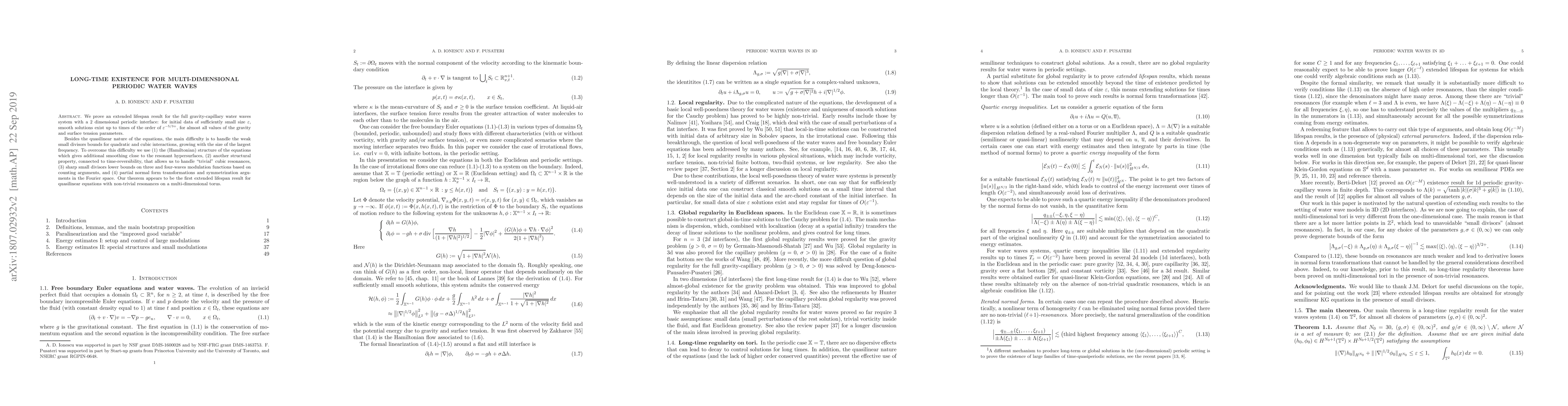 This paper proves extended lifespan results for the full gravity-capillary water waves system with a 2D periodic interface, showing smooth solutions exist up to times proportional to $\varepsilon^{-5/3+}$ for small initial data. The authors overcome difficulties with weak small divisors through Hamiltonian structure, time-reversibility properties, and advanced modulation function bounds.