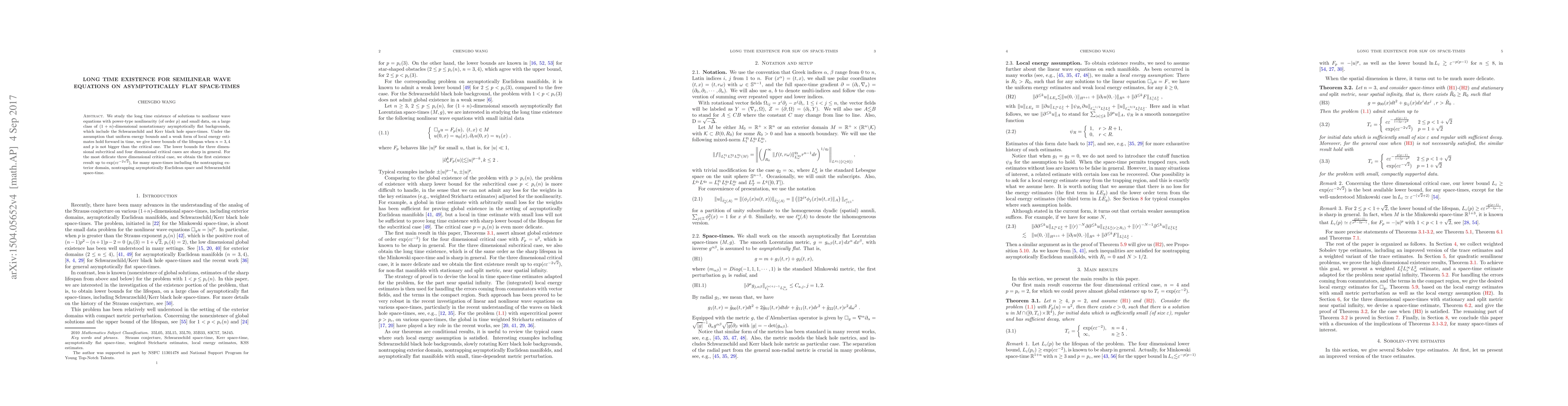 This research establishes long-term existence for semilinear wave equations with power-type nonlinearity and small data on various asymptotically flat space-times, including Schwarzschild and Kerr black holes. It provides lower bounds for lifespan in dimensions 3 and 4 for subcritical and critical cases, respectively, with sharpness confirmed in several instances. Notably, it offers the first existence result up to exp(cε^(-2√2)) for certain space-times in the challenging three-dimensional critical case.