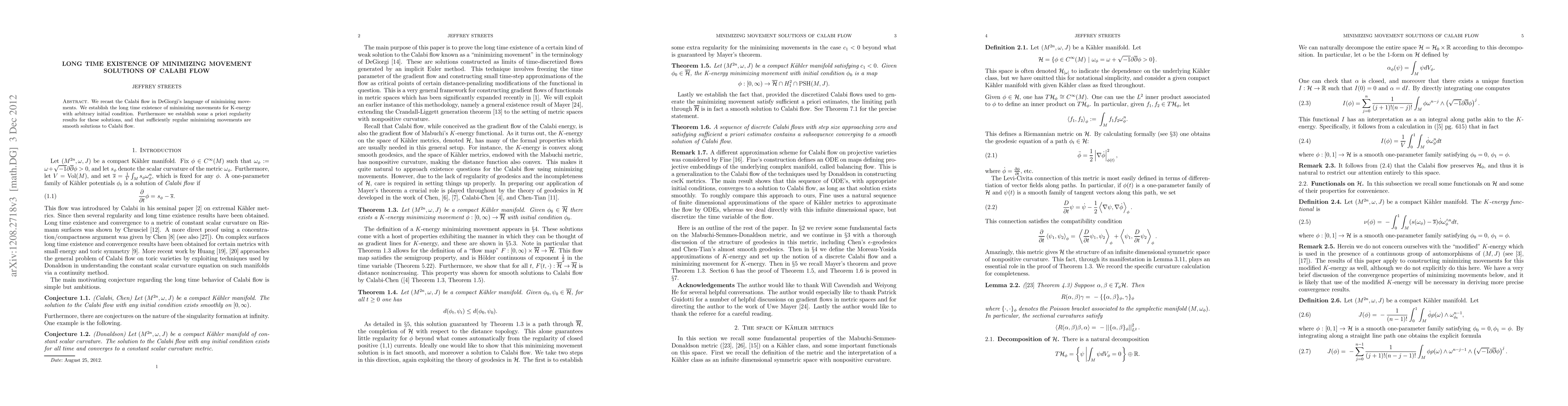 We recast the Calabi flow in DeGiorgi's language of minimizing movements. We establish the long time existence of minimizing movements for K-energy with arbitrary initial condition. Furthermore we establish some a priori regularity of these solutions, and that sufficiently regular minimizing movements are smooth solutions to Calabi flow.