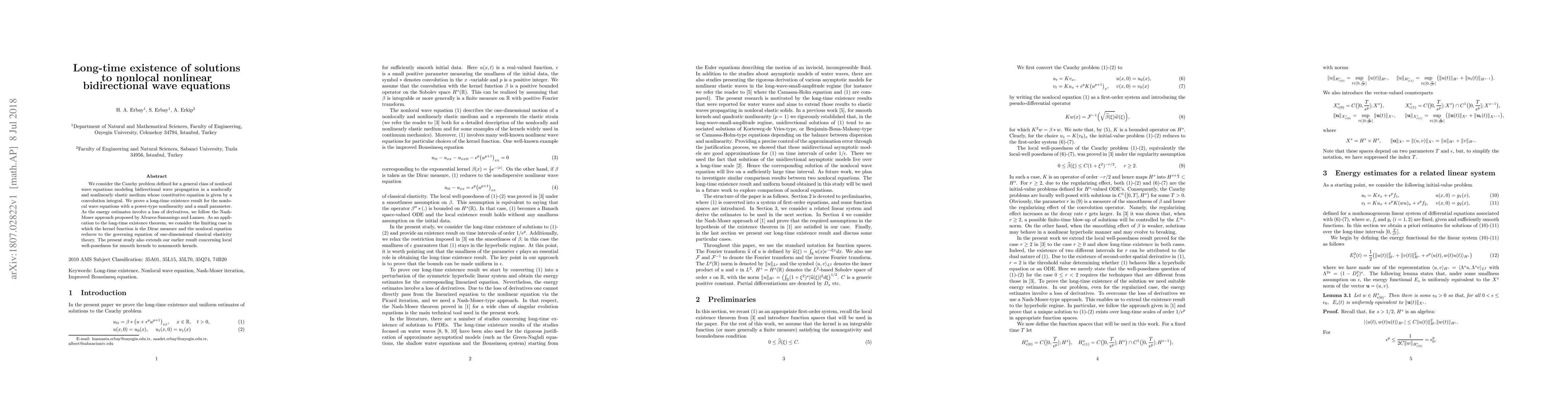 This paper proves long-time existence for solutions to nonlocal nonlinear bidirectional wave equations using the Nash-Moser approach, extending prior results on local well-posedness to nonsmooth kernels, and applies the theory to the classical elasticity equation when the kernel is the Dirac measure.