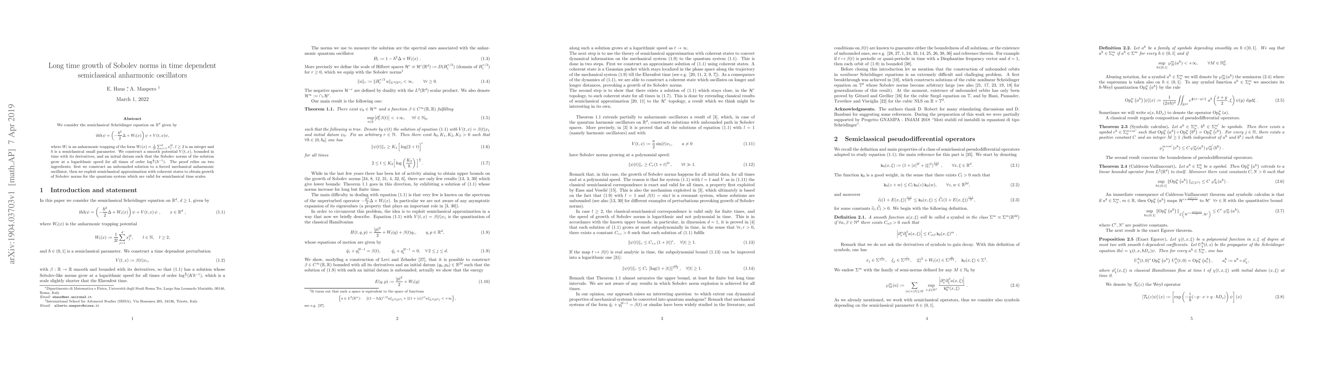 This paper investigates the long-time growth of Sobolev norms in semiclassical time-dependent anharmonic oscillators, showing that they grow logarithmically for times of order $\log^{\frac{1}{2}}(\hbar^{-1})$. The proof combines a construction of a forced mechanical anharmonic oscillator solution and semiclassical approximation using coherent states.