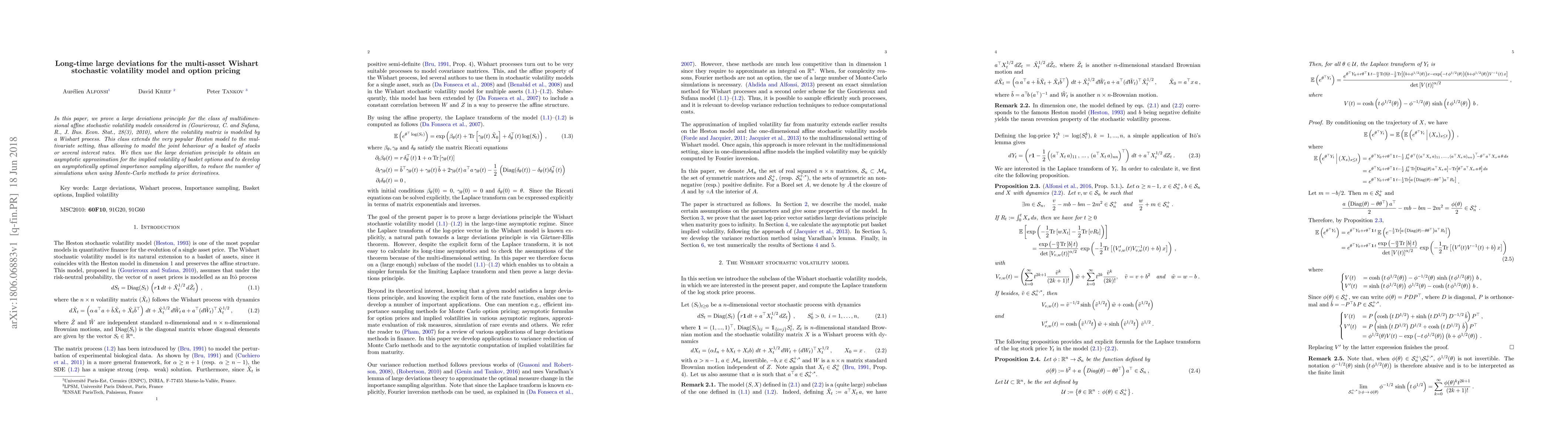 We prove a large deviations principle for the class of multidimensional affine stochastic volatility models considered in (Gourieroux, C. and Sufana, R., J. Bus. Econ. Stat., 28(3), 2010), where the volatility matrix is modelled by a Wishart process. This class extends the very popular Heston model to the multivariate setting, thus allowing to model the joint behaviour of a basket of stocks or several interest rates. We then use the large deviation principle to obtain an asymptotic approximation for the implied volatility of basket options and to develop an asymptotically optimal importance sampling algorithm, to reduce the number of simulations when using Monte-Carlo methods to price derivatives.